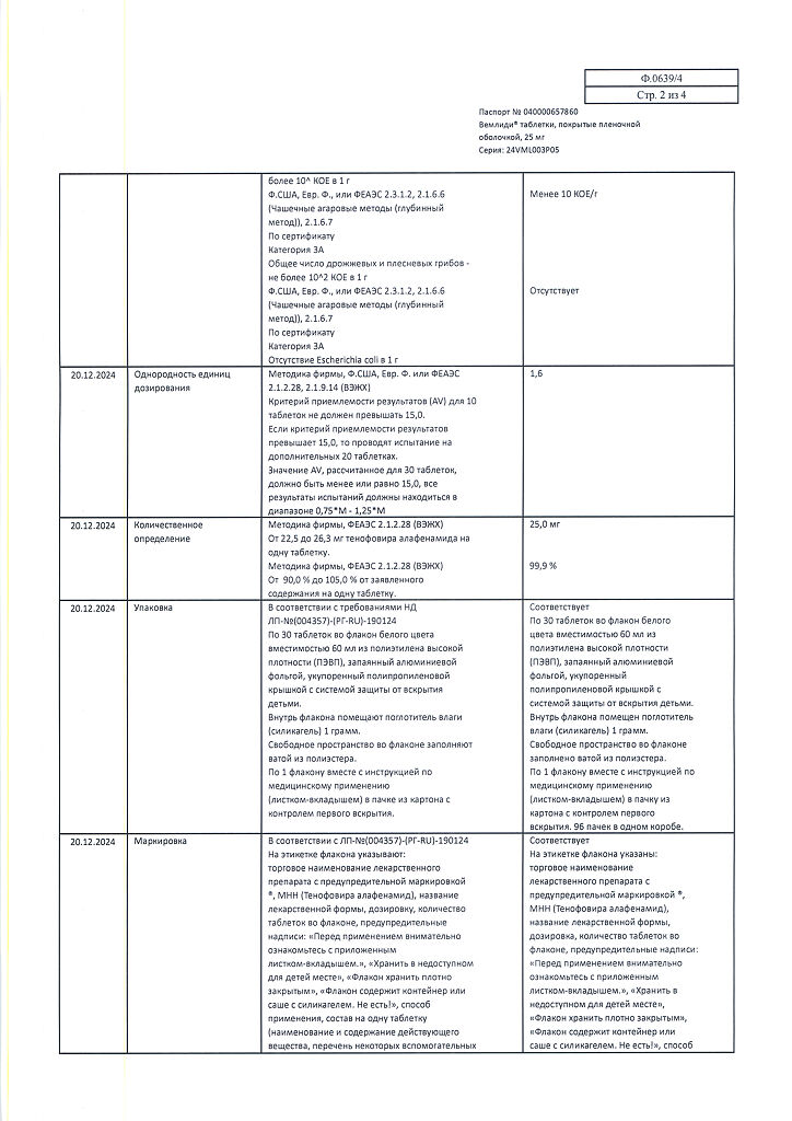 В рамках объединенного анализа пациентов, получающих препарат Вемлиди®, для пациентов, у которых произошел вирусологический прорыв (2 визита подряд с ДНК ВГВ ≥ 69 МЕ/мл после снижения < 69 МЕ/мл или увеличение ДНК ВГВ на 1,0 log10 или выше по сравнению с самым низким уровнем) или у которых уровень ДНК ВГВ составил ≥ 69 МЕ/мл на 96-й неделе или при преждевременном прекращении лечения на 24-ой неделе или позднее, был проведен анализ генетической последовательности в парных пробах, включающих исходные штаммы ВГВ и штаммы ВГВ, выделенные в ходе лечения. При анализе на 48-й (N=20) и 96-й неделе (N=72) в этих штаммах не были выявлены замены аминокислот, обусловленные устойчивостью к препарату Вемлиди® (генотипические и фенотипические исследования).