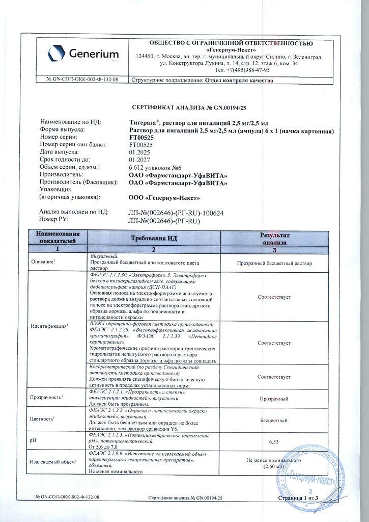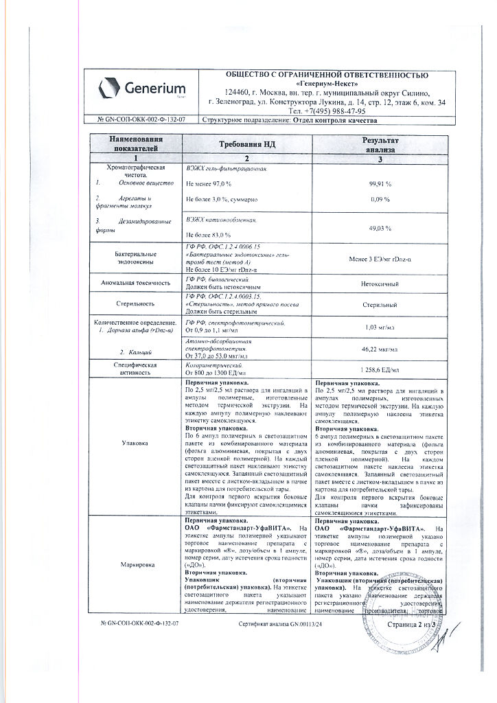 Распределение. У больных муковисцидозом средняя концентрация ДНазы в мокроте через 15 мин после ингаляции в дозе 2500 ЕД (2,5 мг) составляет примерно 3,0 мкг/мл. После ингаляции концентрация ДНазы в мокроте быстро уменьшается.