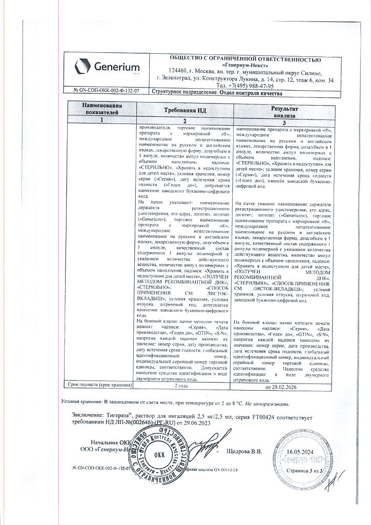 В течение 2 ч концентрация ДНазы в мокроте снижается более чем в 2 раза по сравнению со значением сразу после ингаляции, однако действие на реологию мокроты сохраняется более 12 ч.
