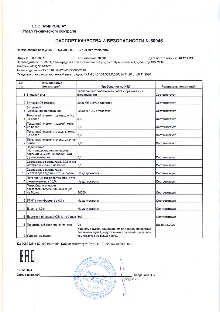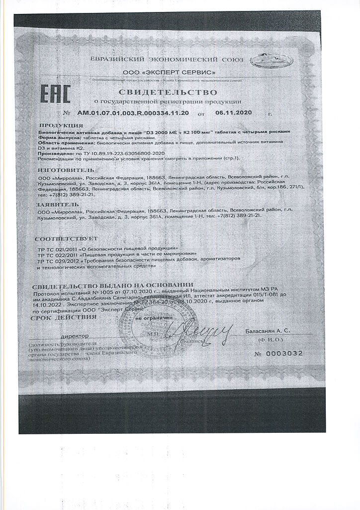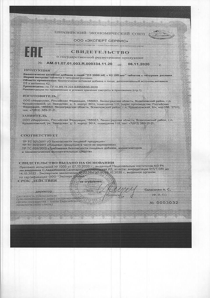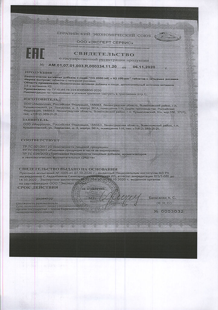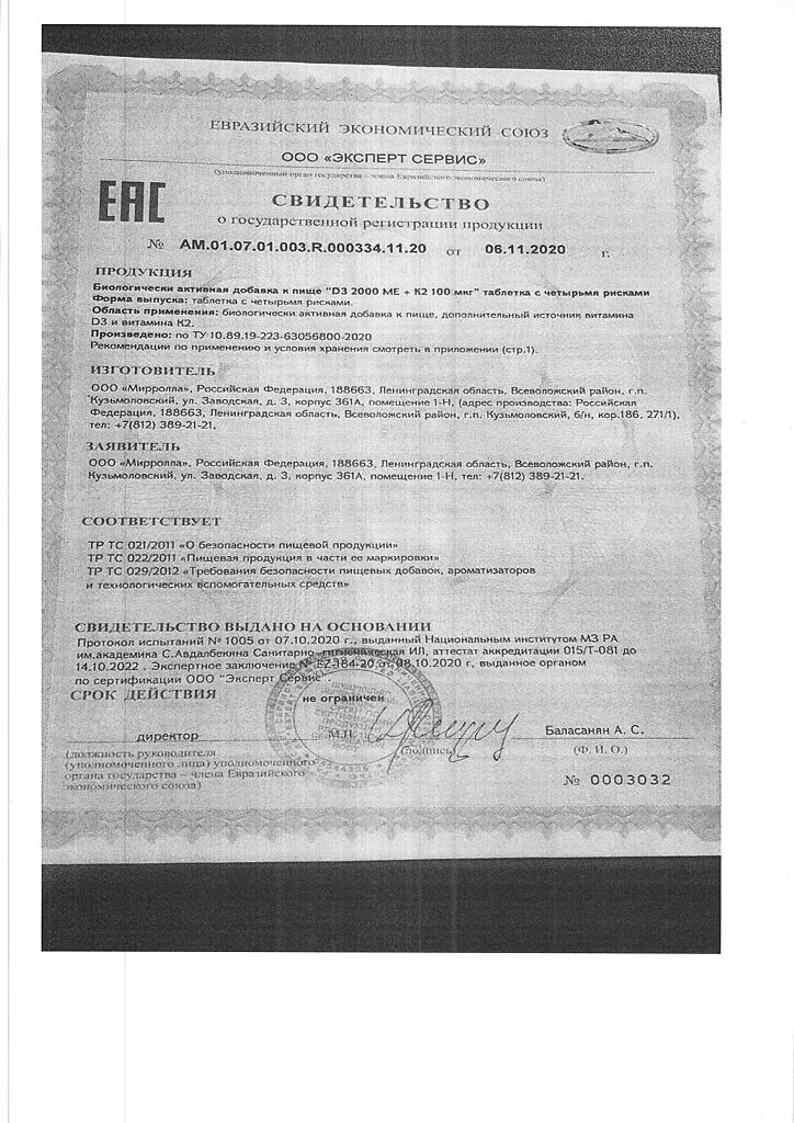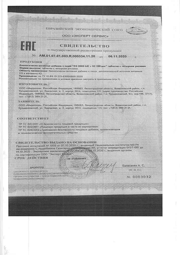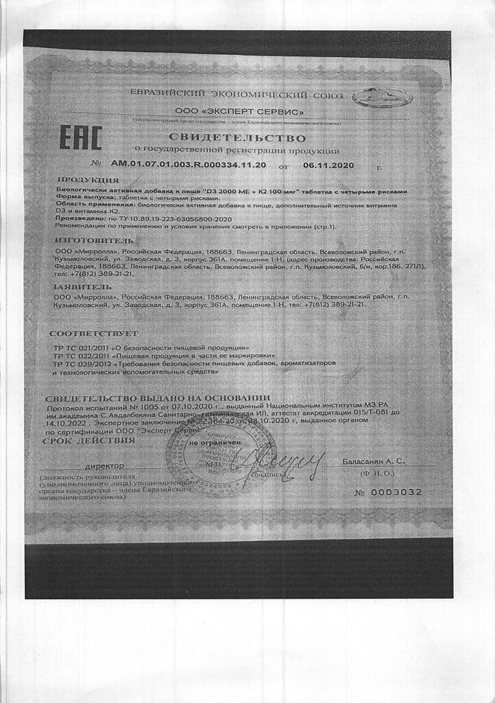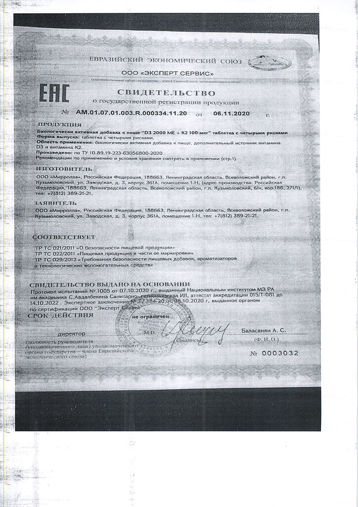 Документы Mirrolla Витамин D3 2000 ME+К2 таблетки 60 шт