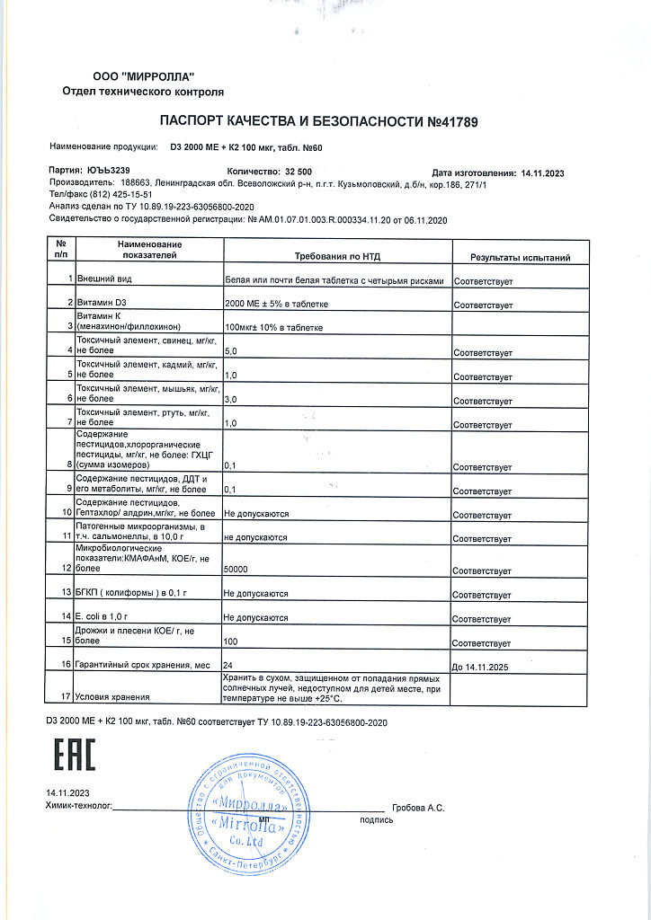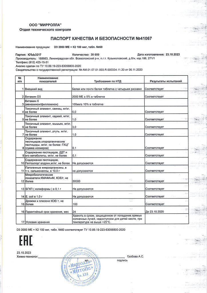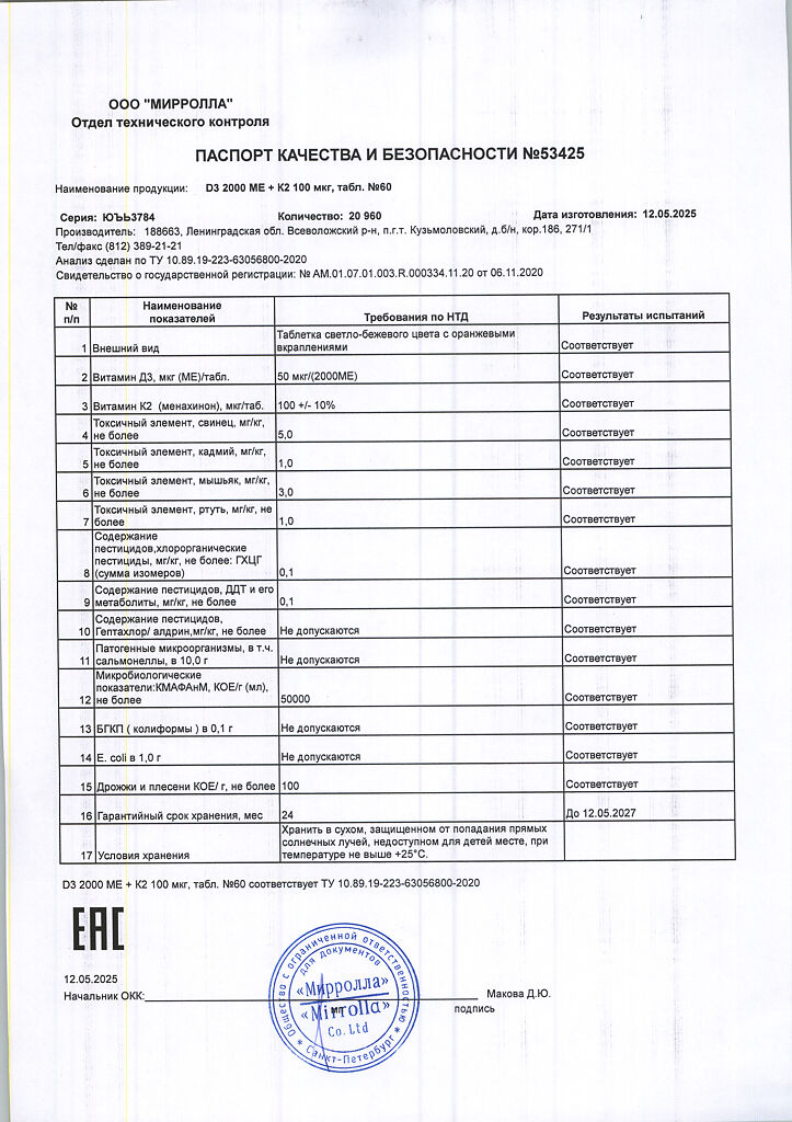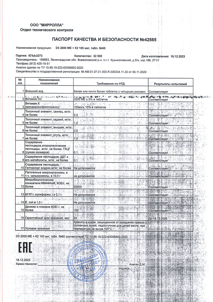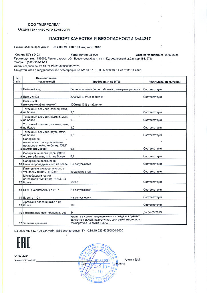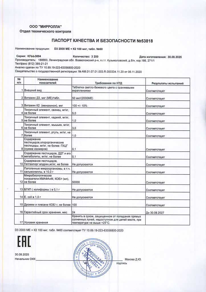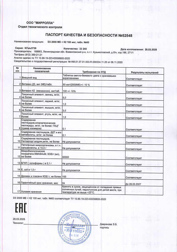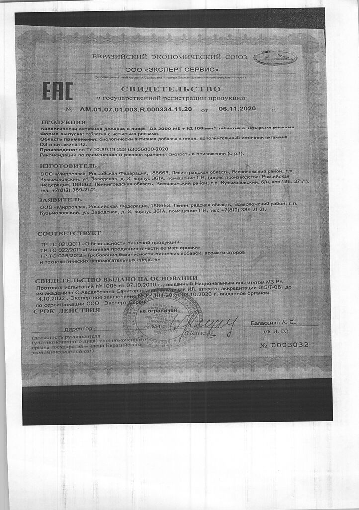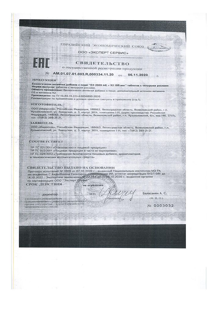 Документы Mirrolla Витамин D3 2000 ME+К2 таблетки 60 шт