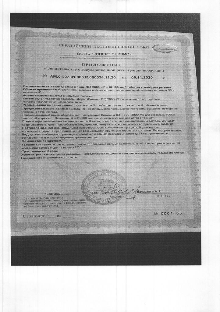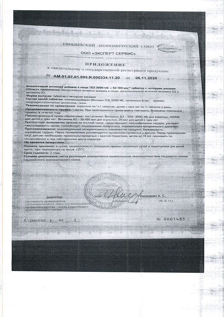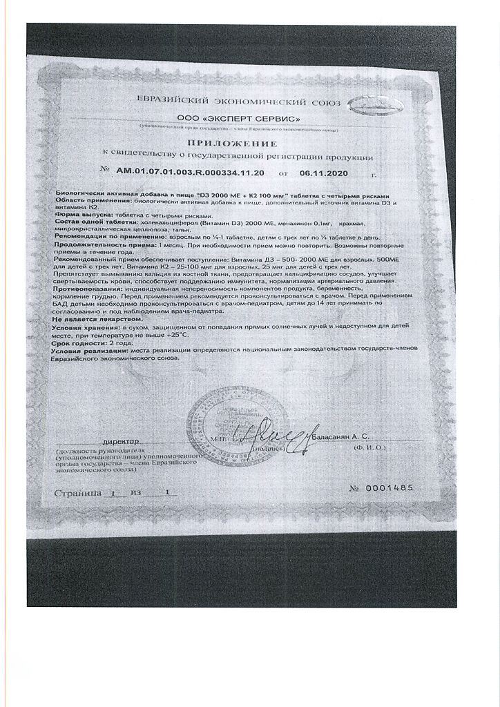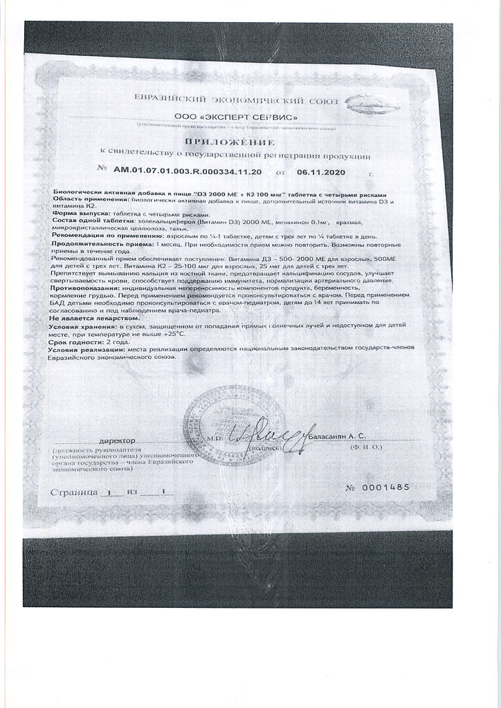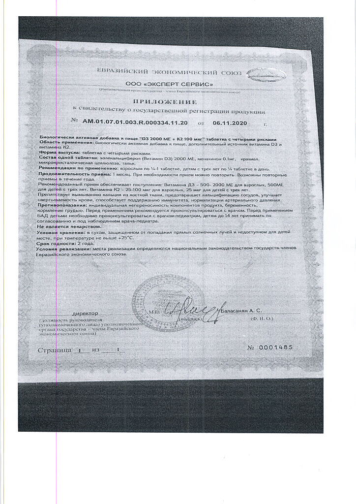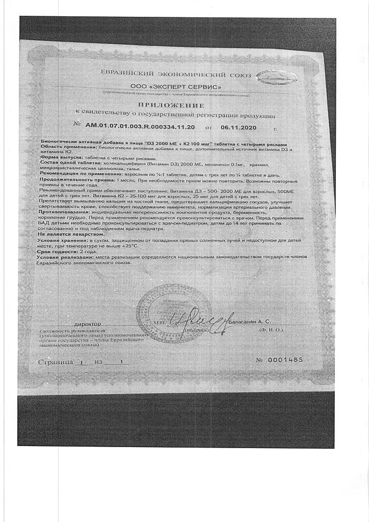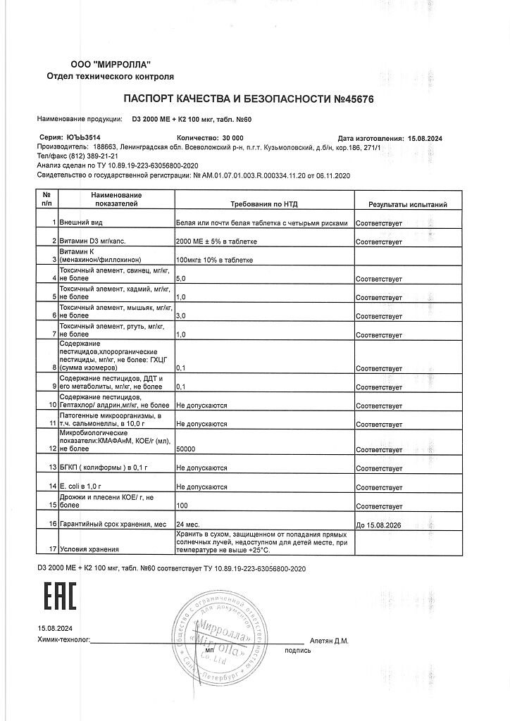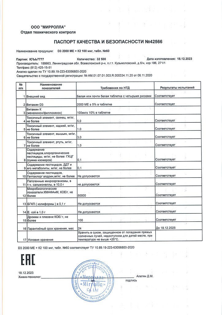 Документы Mirrolla Витамин D3 2000 ME+К2 таблетки 60 шт