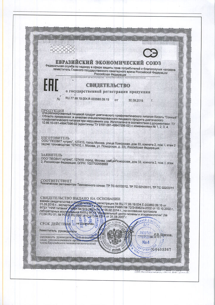 Документы Леовит Кисель Сонный банка 400 г 1 шт