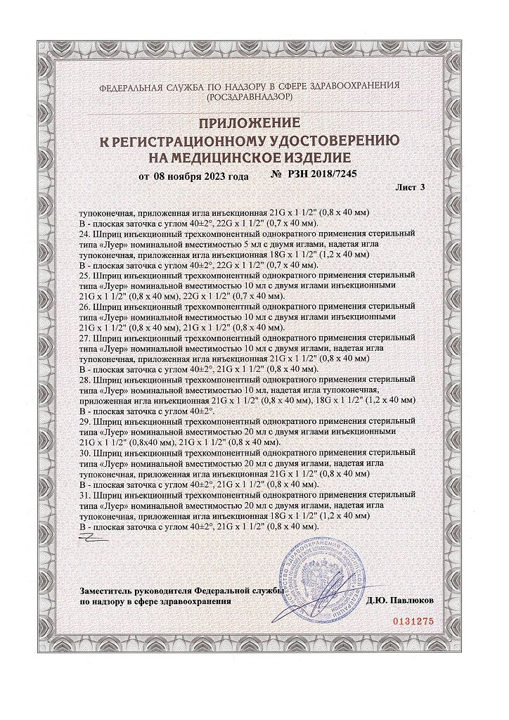 Документы Шприц 3-х компонентный Pascal 5 мл с иглой 22G (0,7х30 мм) 100 шт