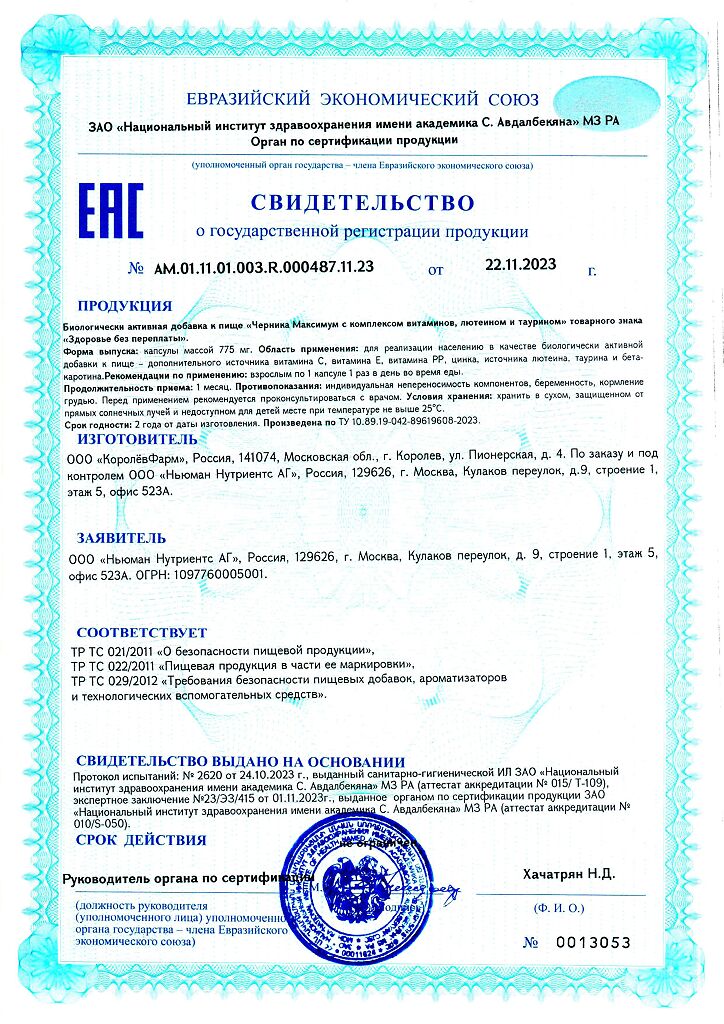 Документы Черника Максимум с комплексом витаминов, лютеином и таурином капсулы массой 775 мг 30 шт