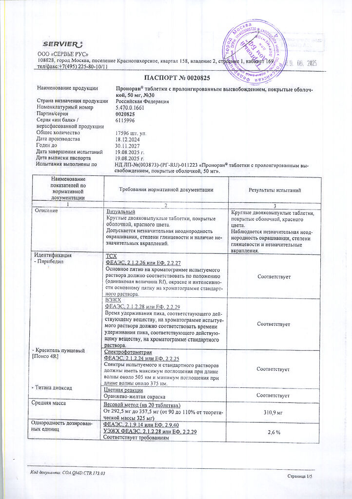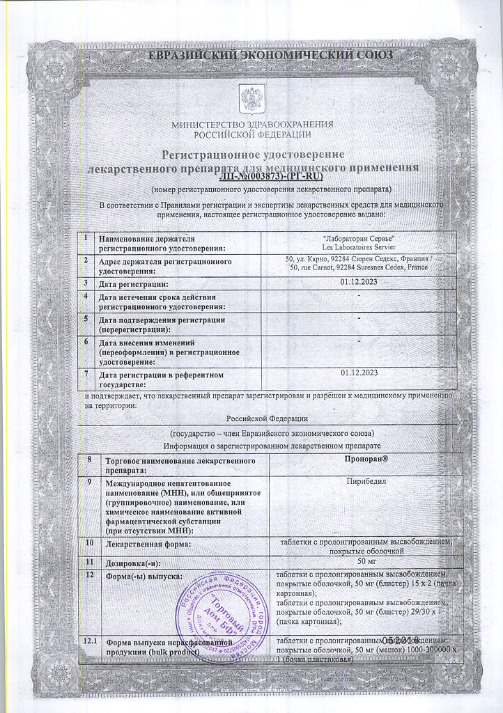 Cmax пирибедила в плазме крови достигается через 3–6 ч после перорального приема лекарственной формы с контролируемым высвобождением. Связывание с белками плазмы — среднее (несвязанная фракция составляет 20–30%). В связи с низкой связываемостью пирибедила с белками плазмы риск лекарственного взаимодействия при применении с другими препаратами низкий.