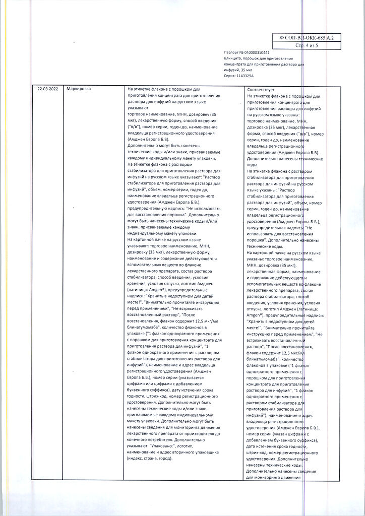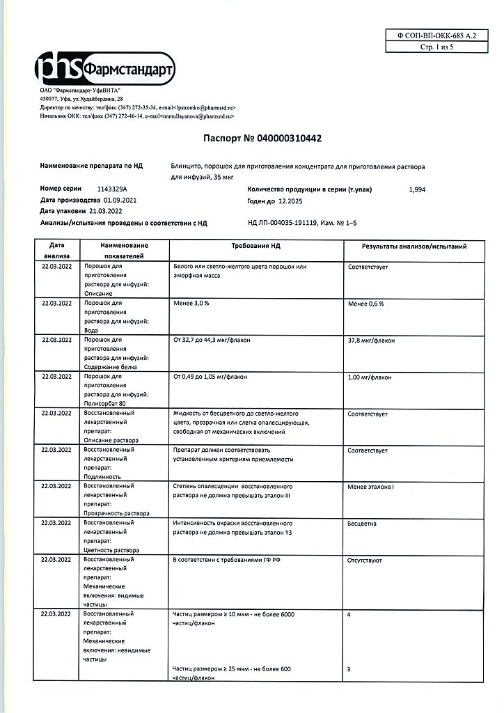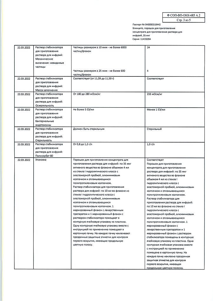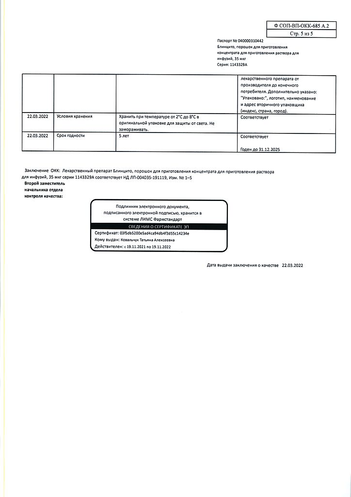 • Хранить при температуре от 2 до 8 °C в оригинальной упаковке для защиты от света. Не замораживать. Хранить в недоступном для детей месте! После вскрытия упаковки Максимальное время хранения флакона с порошком препарата Блинцито и раствором стабилизатора для приготовления раствора для инфузий* при температуре от 23 до 27 °С составляет 8 часов. Максимальное время хранения флакона восстановленного раствора препарата Блинцито* при температуре от 23 до 27 °С составляет 4 часа; при температуре от 2 до 8 °C – 24 часа. Максимальное время хранения приготовленного инфузионного пакета, содержащего раствор препарата Блинцито для инфузий**, при температуре от 23 до 27 °C составляет 96 часов*; при температуре от 2 до 8 °C – 10 суток. *Хранить флаконы с порошком препарата Блинцито и раствором стабилизатора для приготовления раствора для инфузий в защищенном от света месте. **Время хранения включает в себя время инфузии. Если инфузионный пакет, содержащий раствор препарата Блинцито для инфузий, не использован в указанные сроки и при указанных температурах, он должен быть утилизирован; повторное охлаждение в холодильнике не допускается.