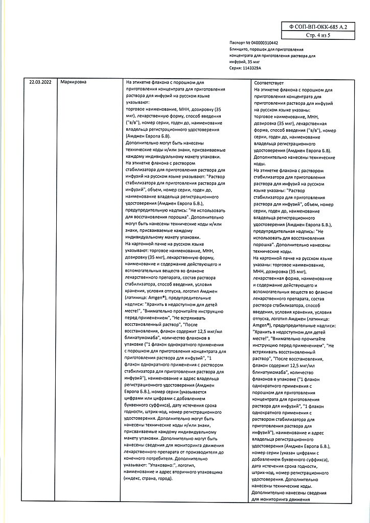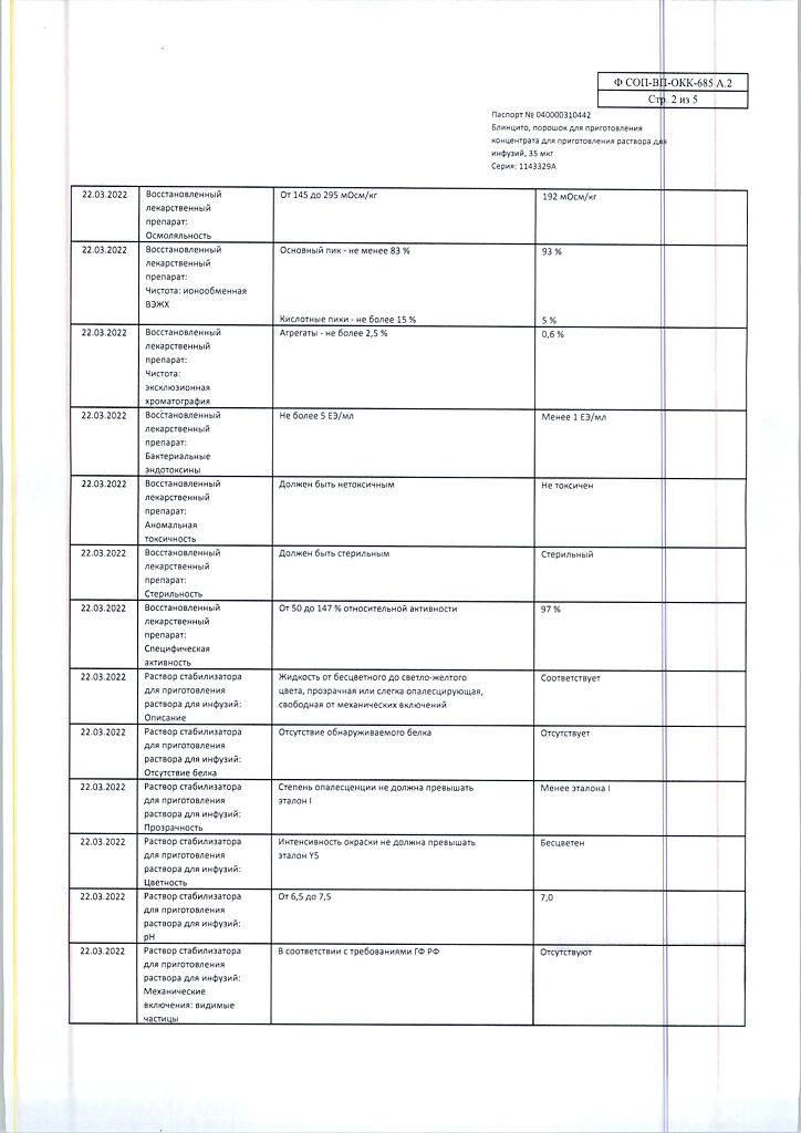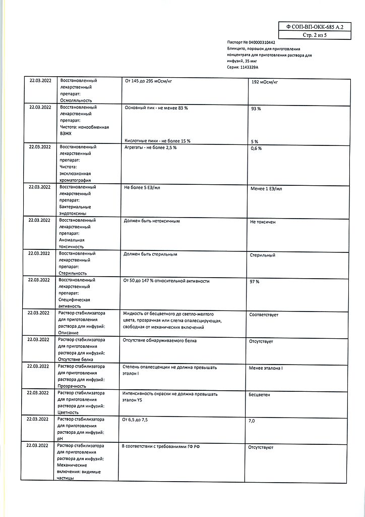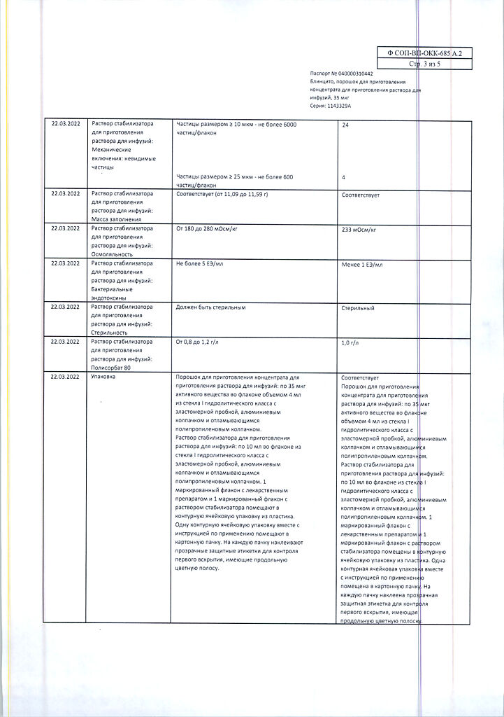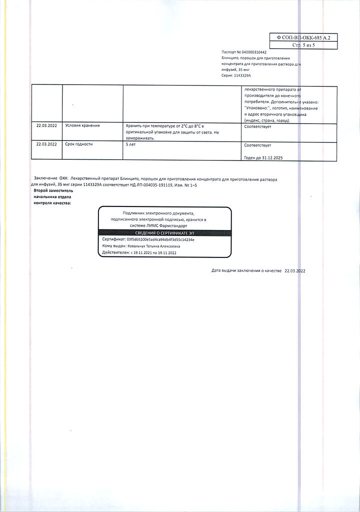 • Хранить при температуре от 2 до 8 °C в оригинальной упаковке для защиты от света. Не замораживать. Хранить в недоступном для детей месте! После вскрытия упаковки Максимальное время хранения флакона с порошком препарата Блинцито и раствором стабилизатора для приготовления раствора для инфузий* при температуре от 23 до 27 °С составляет 8 часов. Максимальное время хранения флакона восстановленного раствора препарата Блинцито* при температуре от 23 до 27 °С составляет 4 часа; при температуре от 2 до 8 °C – 24 часа. Максимальное время хранения приготовленного инфузионного пакета, содержащего раствор препарата Блинцито для инфузий**, при температуре от 23 до 27 °C составляет 96 часов*; при температуре от 2 до 8 °C – 10 суток. *Хранить флаконы с порошком препарата Блинцито и раствором стабилизатора для приготовления раствора для инфузий в защищенном от света месте. **Время хранения включает в себя время инфузии. Если инфузионный пакет, содержащий раствор препарата Блинцито для инфузий, не использован в указанные сроки и при указанных температурах, он должен быть утилизирован; повторное охлаждение в холодильнике не допускается.