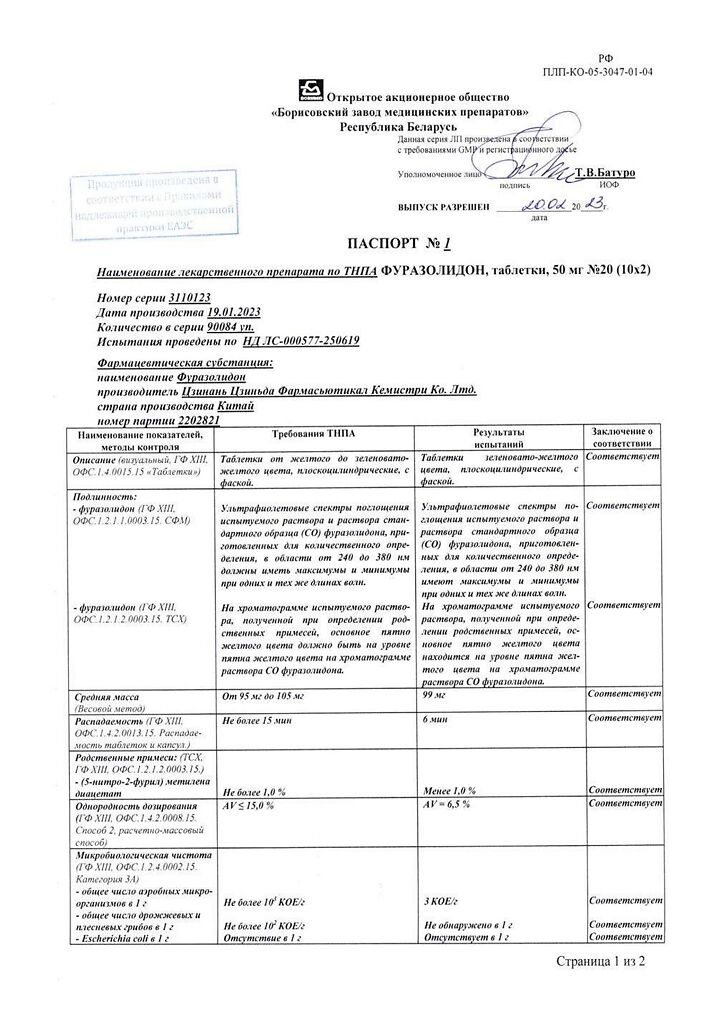 Действующее вещество: фуразолидона 50 мг.