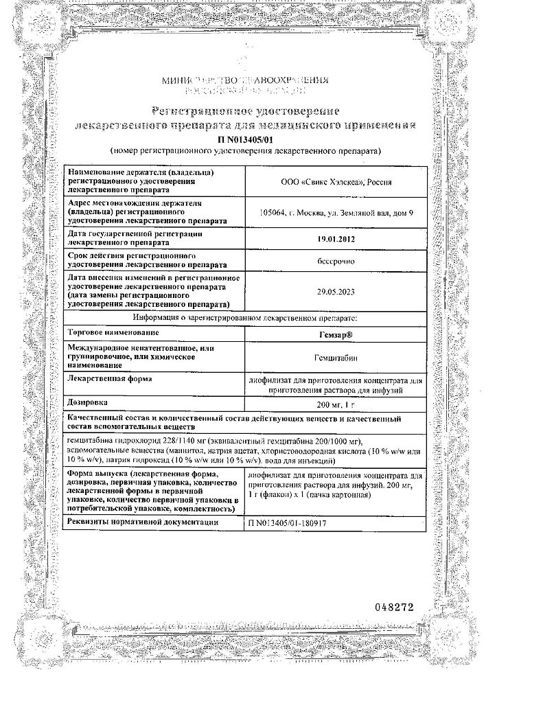 Комбинированная терапия с паклитакселом: в качестве терапии первой линии при прогрессировании заболевания после неоадъювантной и/или адъювантной терапии, включающей антрациклины при отсутствии противопоказаний к ним. Паклитаксел вводят в дозе 175 мг/м2 в/в капельно в течение 3 ч в 1 день 21-дневного цикла с последующим введением гемцитабина. Рекомендованная доза препарата - 1250 мг/м2 в 1 и 8 день каждого 21-дневного цикла.