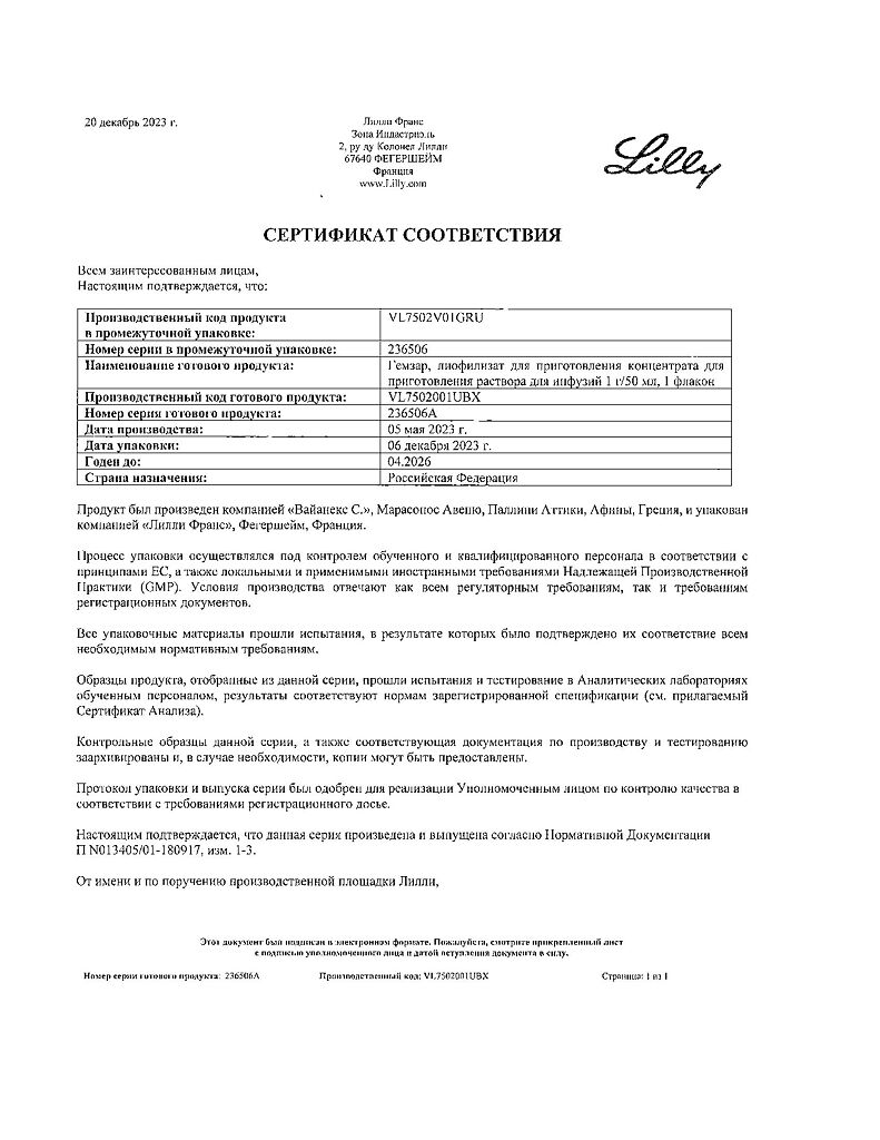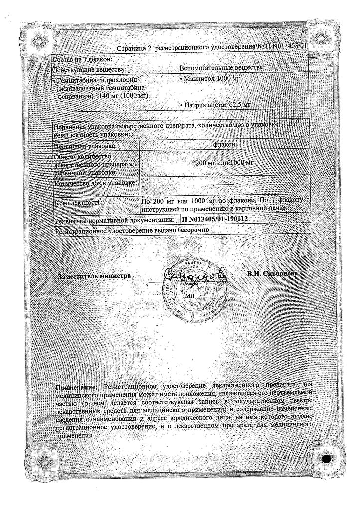 гемцитабина гидрохлорид 1,14 г, что соответствует содержанию гемцитабина 1 г.