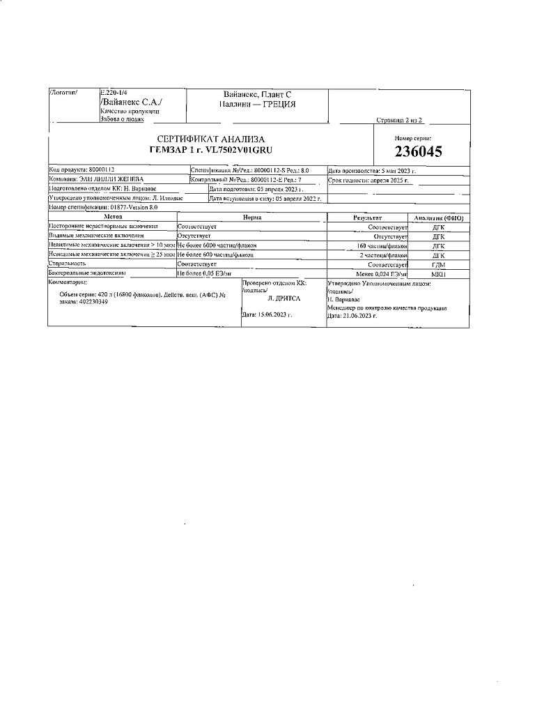 Перед парентеральным введением необходимо визуально контролировать приготовленный раствор на наличие механических примесей и изменение цвета.