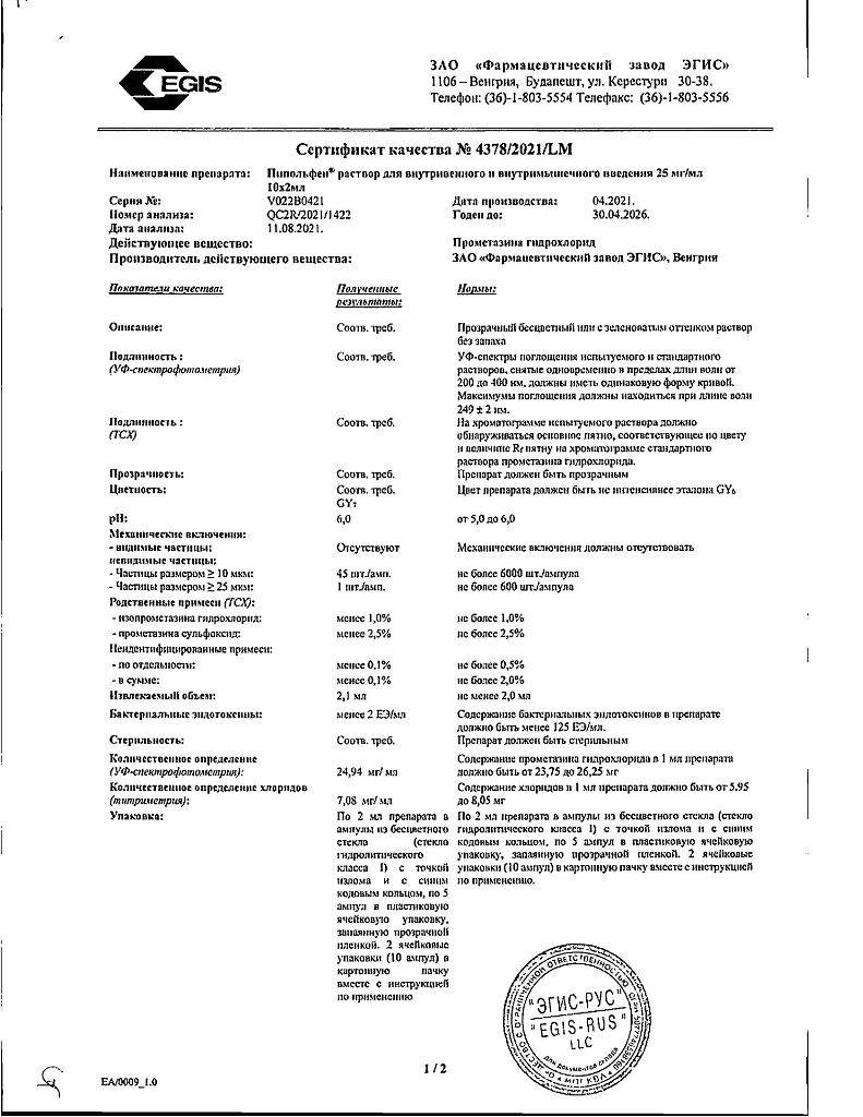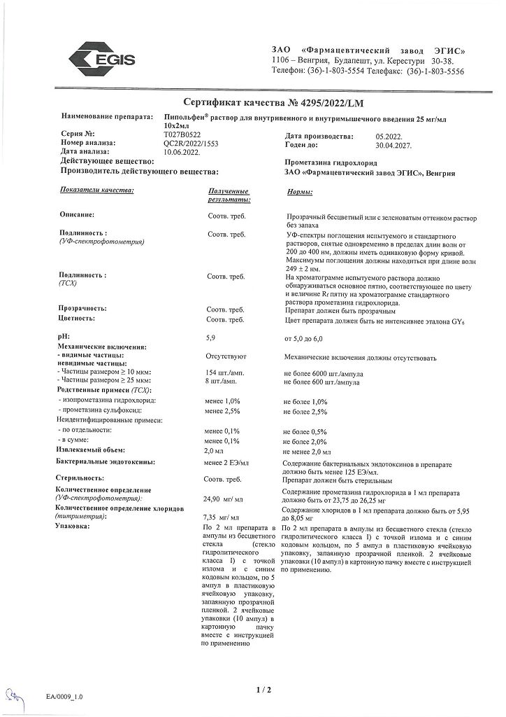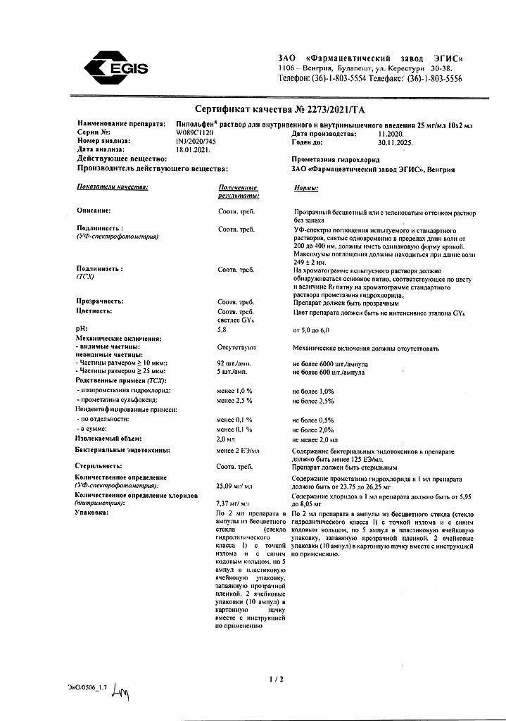 Документы Пипольфен раствор для в/в и в/м введ. 25 мг/мл 2 мл 10 шт