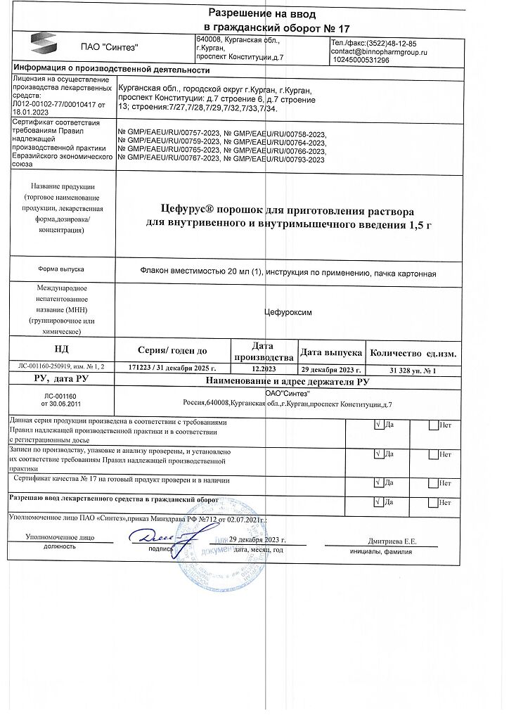 Документы Цефурус порошок д/приг раствора для в/в и в/м введ 1,5 г фл 1 шт