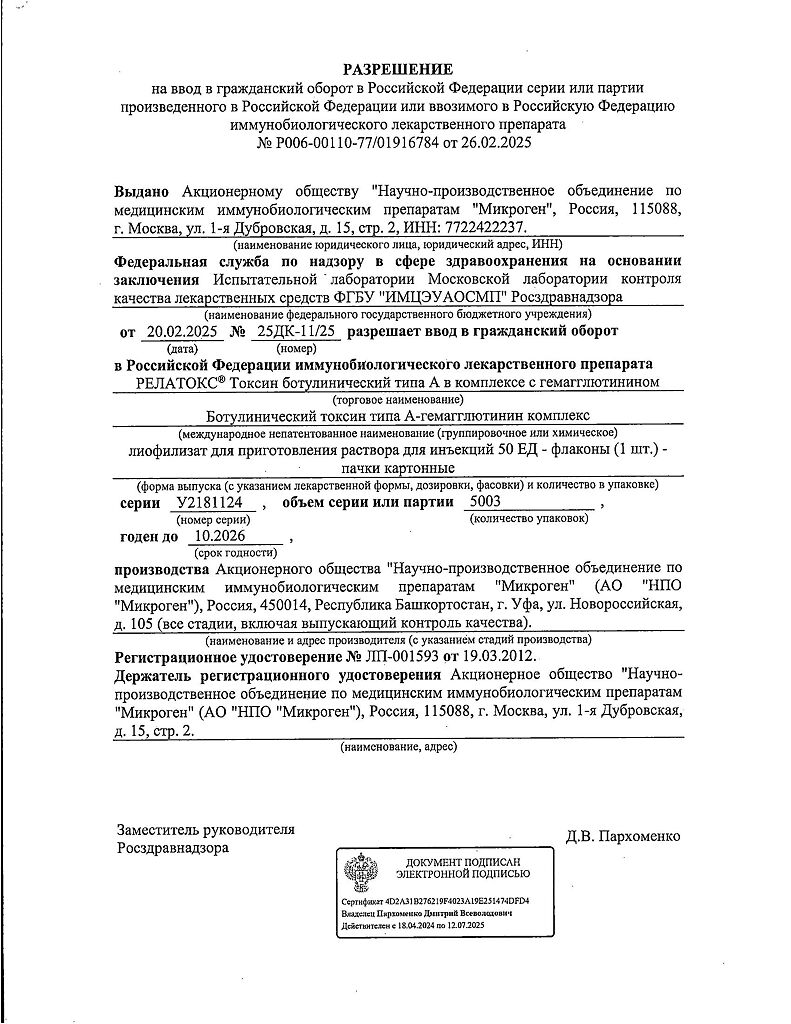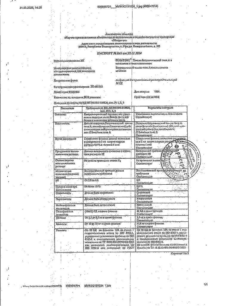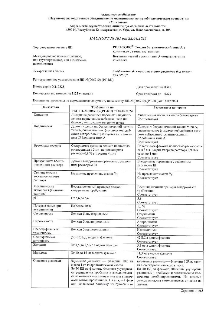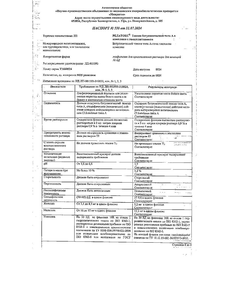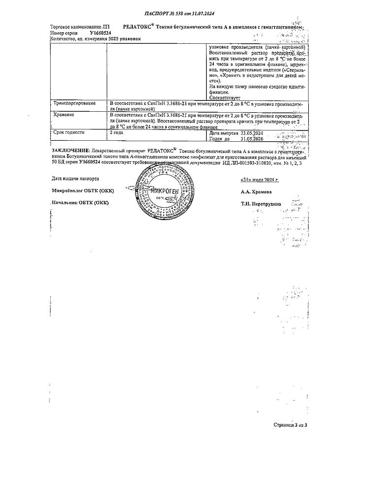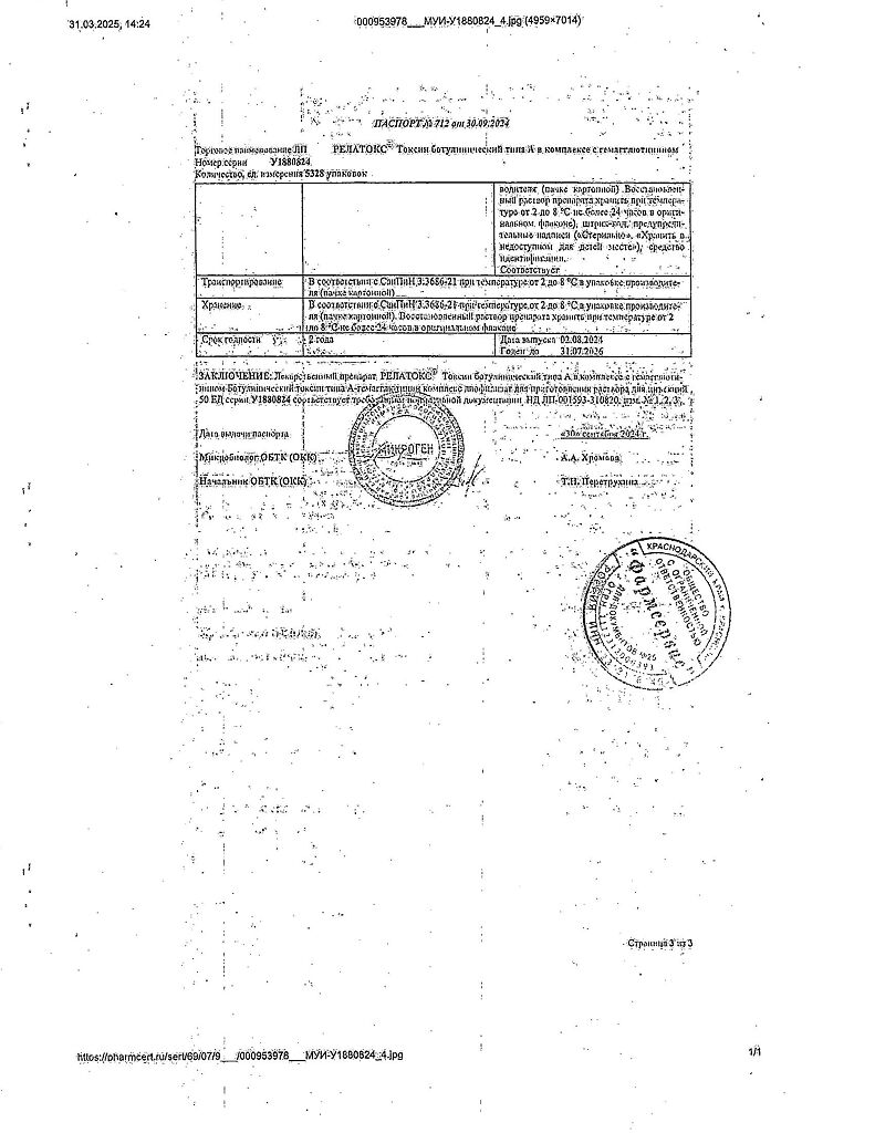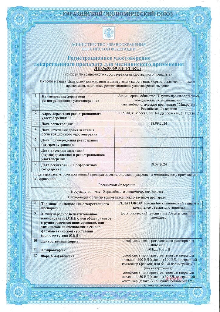 Документы Релатокс лиофилизат д/приг раствора для инъекций 50 ед 1 шт