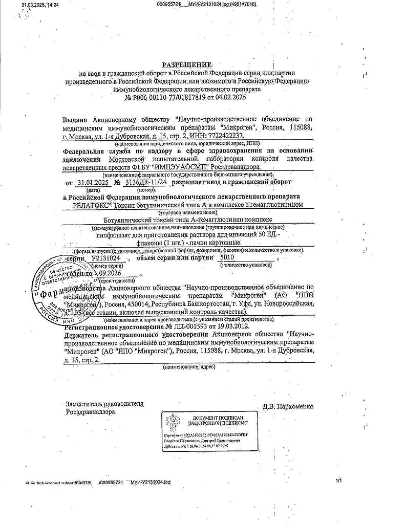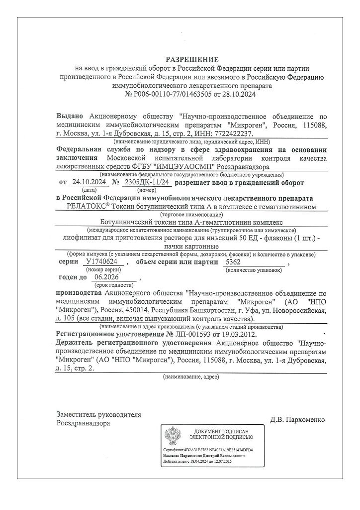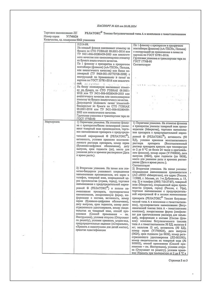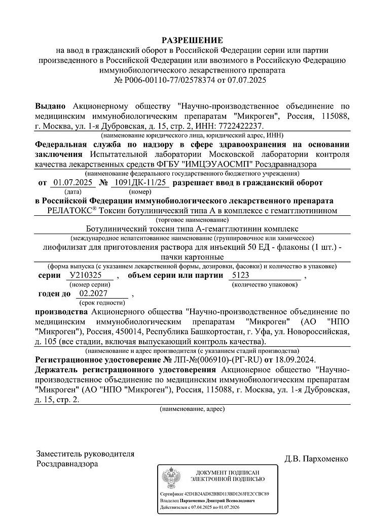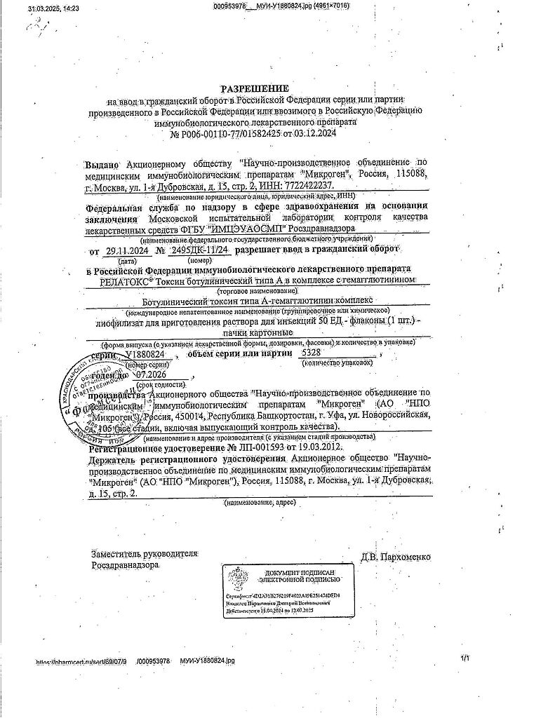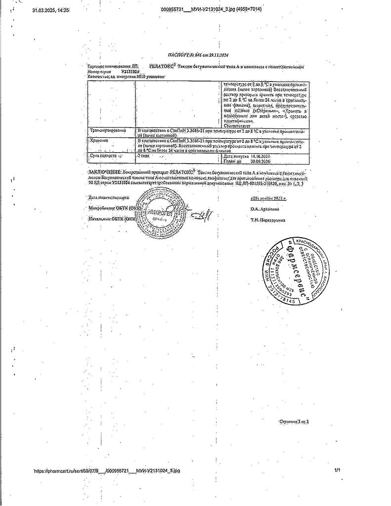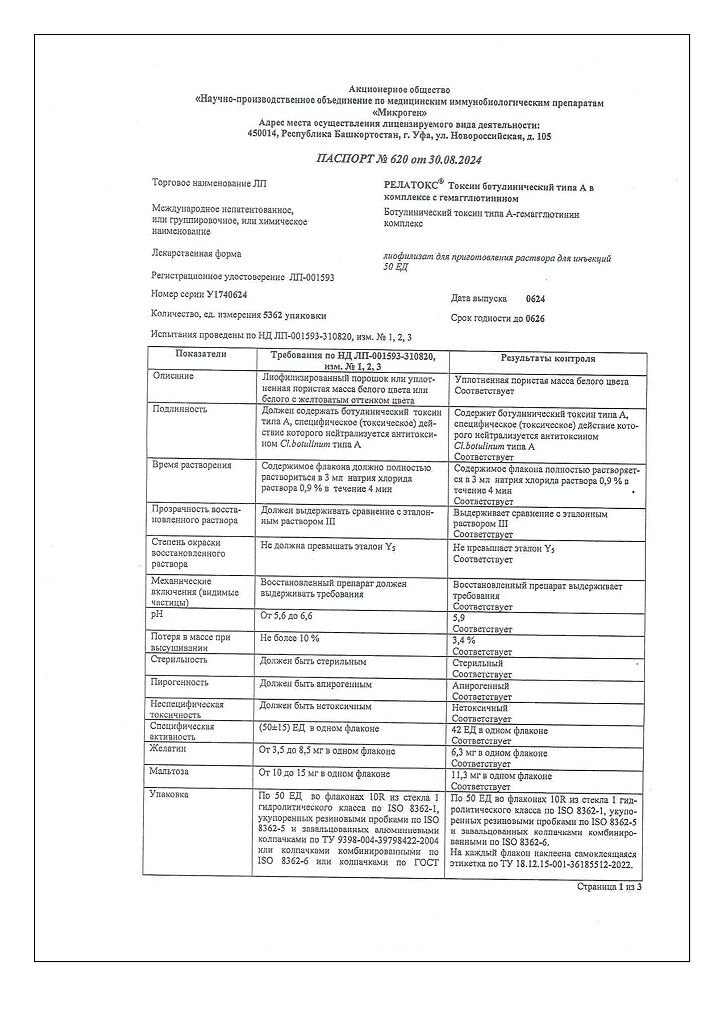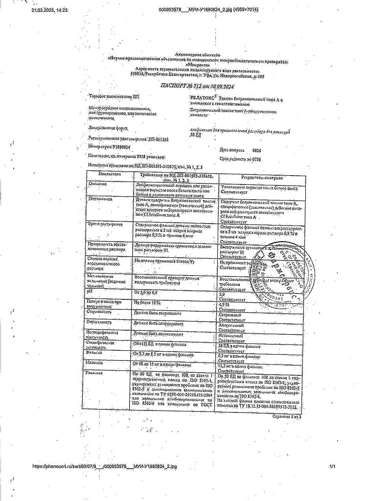 Документы Релатокс лиофилизат д/приг раствора для инъекций 50 ед 1 шт