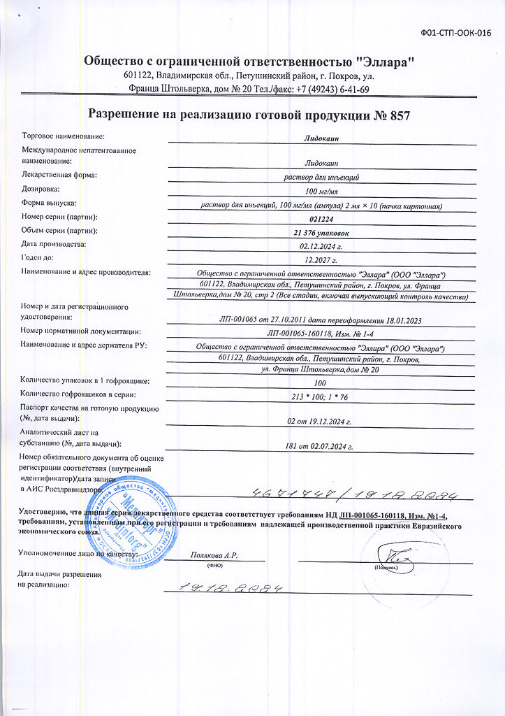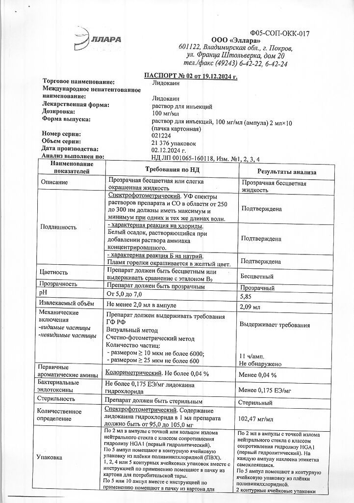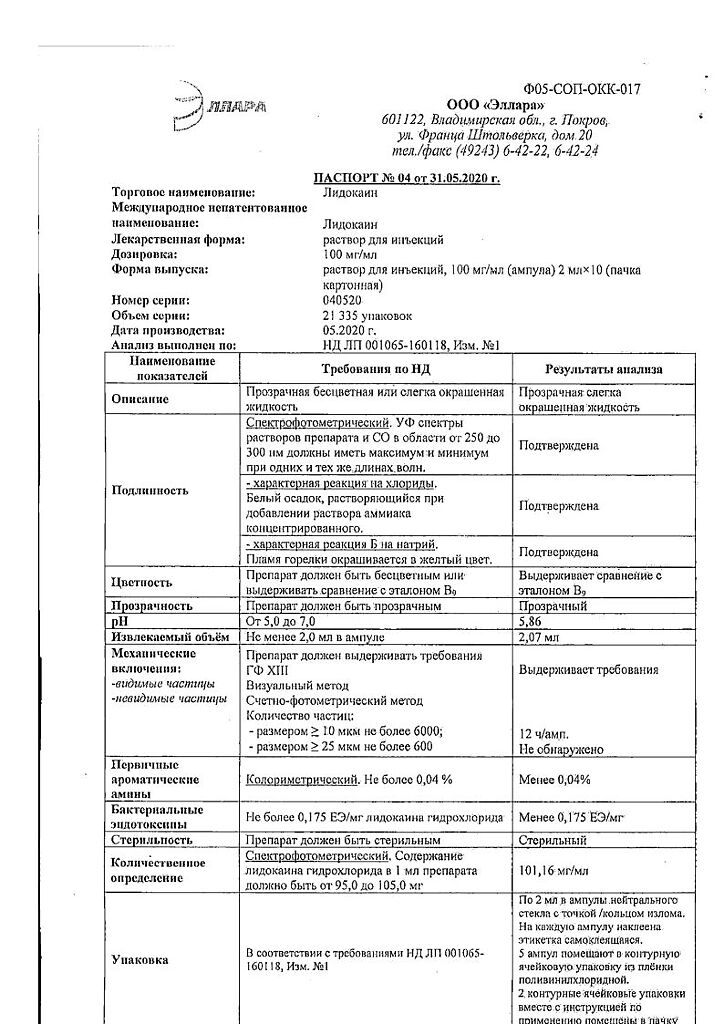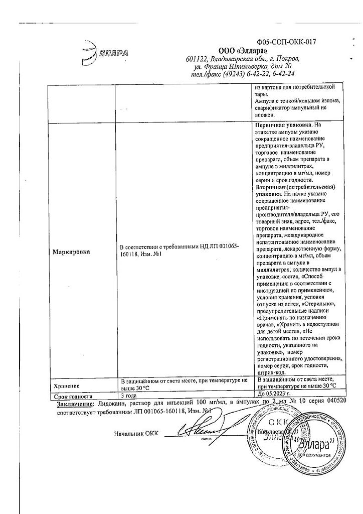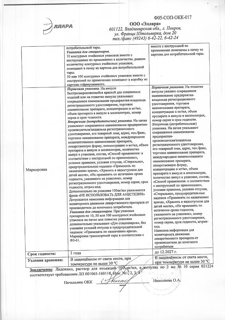 Документы Лидокаин раствор для инъекций 100 мг/мл 2 мл амп 10 шт