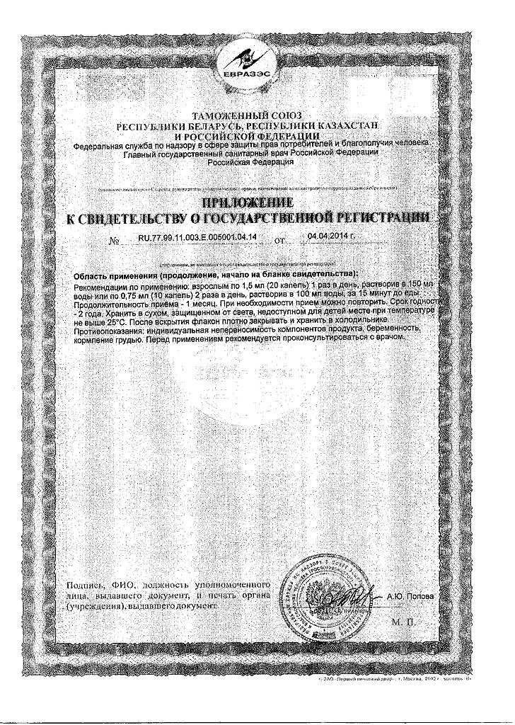 Взрослым по 1,5 мл (20 капель) 1 раз в день, растворив в 150 мл воды или по 0,75 мл (10 капель) 2 раза в день, растворив в 100 мл воды, за 15 минут до еды. Продолжительность приёма - 1 месяц. При необходимости прием можно повторить.