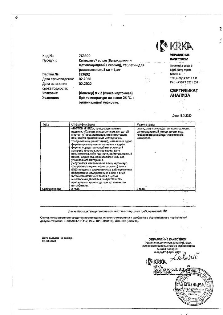 Действующее вещество: Бензидамин, Цетилпиридиния хлорид