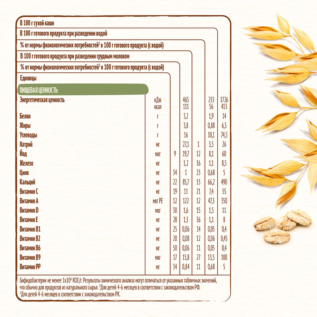 Овсяная мука (86,6%) (содержит глютен), мальтодекстрин, минеральные вещества (кальция карбонат, железа (II) фумарат, цинка сульфат, йодид калия), витамины (С (L-аскорбиновая кислота), E (DL-альфа-токоферола ацетат), РР (никотинамид), A (ретинола ацетат), В1 (тиамина мононитрат), В6 (пиридоксин гидрохлорид), В2 (рибофлавин), B9 (фолиевая кислота), D (D3 холекальциферол)), бифидобактерии не менее 1х10^6 КОЕ/г. Продукт может содержать молоко. Продукт упакован в модифицированной атмосфере с азотом.