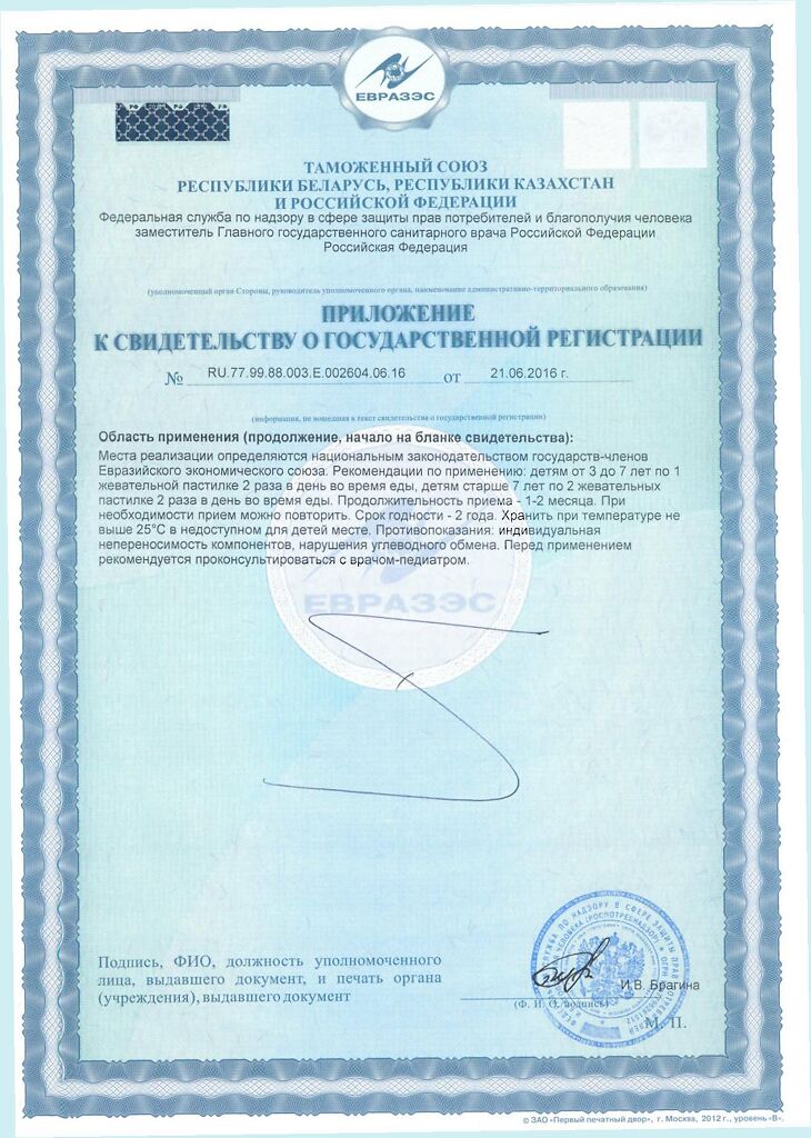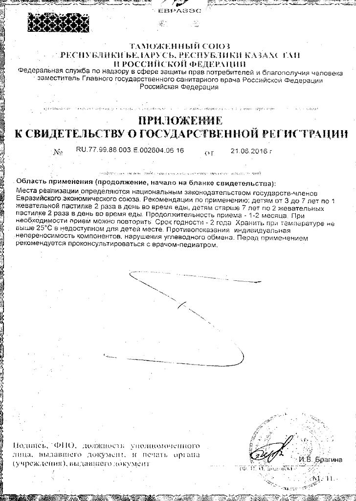Детям от 3 до 7 лет – по 1 жевательной пастилке 2 раза в день во время еды, детям старше 7 лет – по 2 жевательные пастилки 2 раза в день во время еды. Продолжительность приема — 1-2 месяца. При необходимости прием можно повторить.