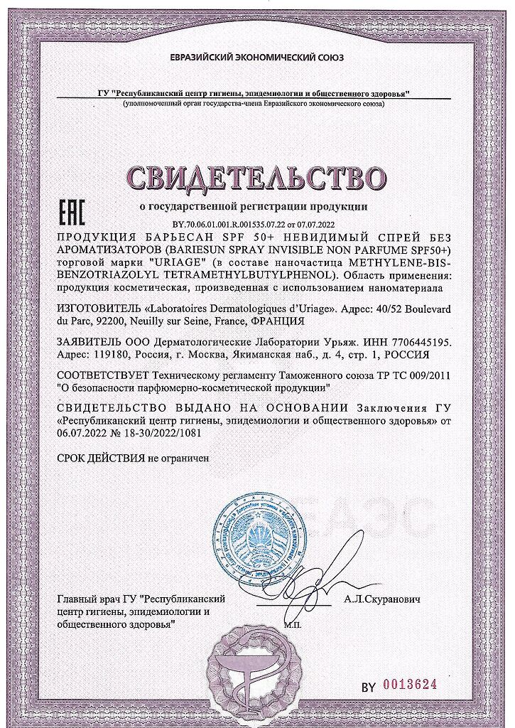 Документы Uriage Bariesun Солнцезащитный спрей без ароматизаторов SPF50+ 200 мл 1 шт