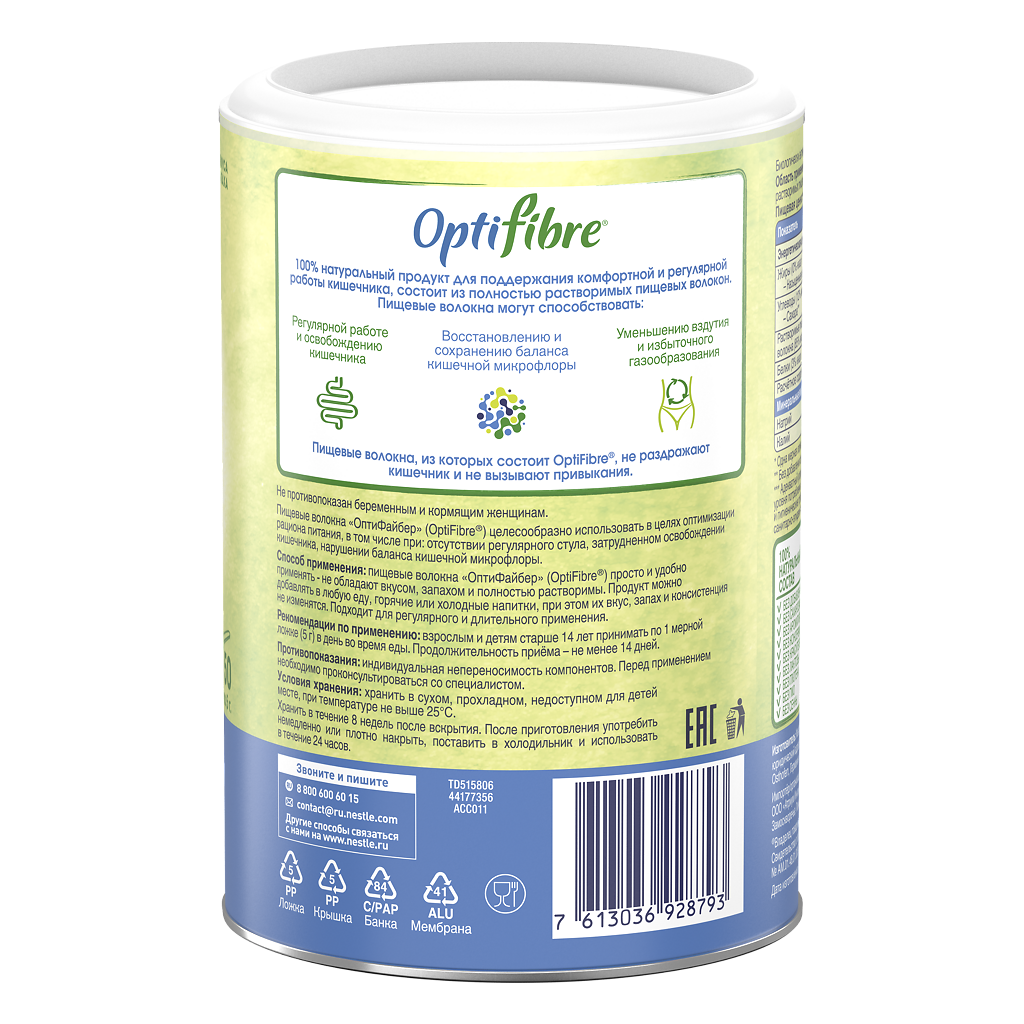 Рекомендуется применять пищевые волокна ОптиФайбер взрослым и детям старше 14 лет по 1 мерной ложке в день во время еды. После приготовления употребить немедленно или плотно накрыть, поставить в холодильник и использовать в течение 24 часов. Продолжительность приема – не менее 14 дней.
