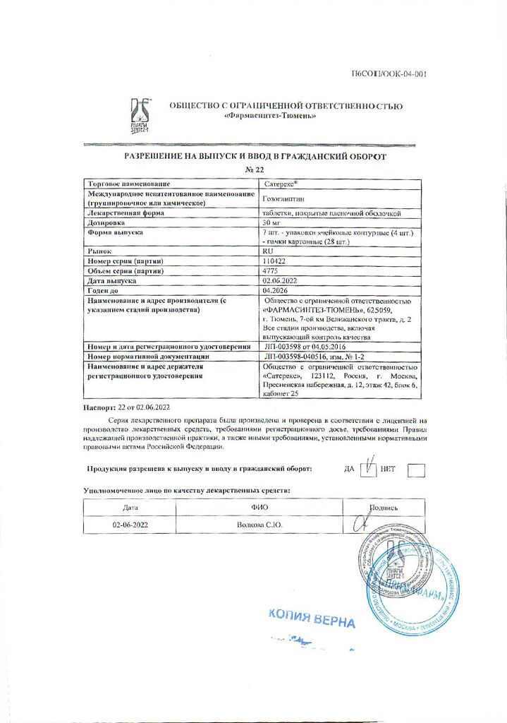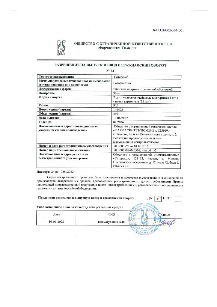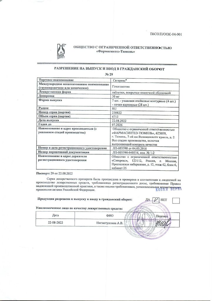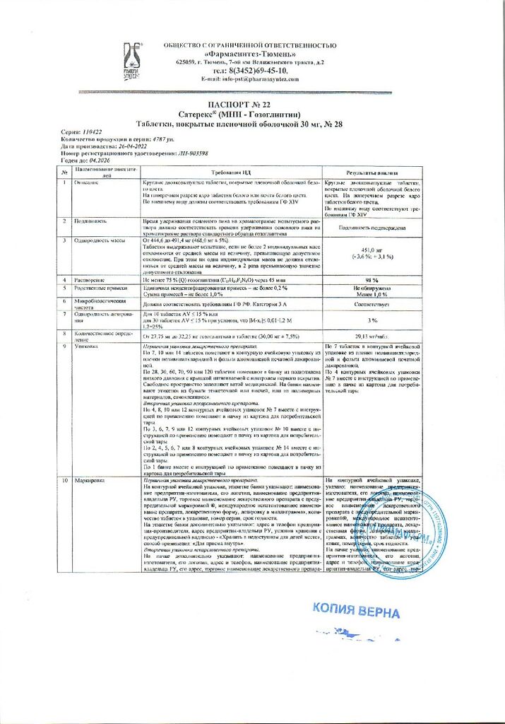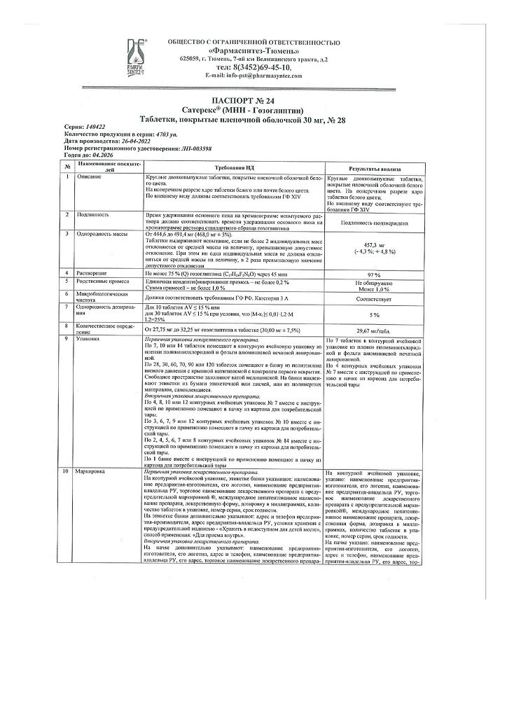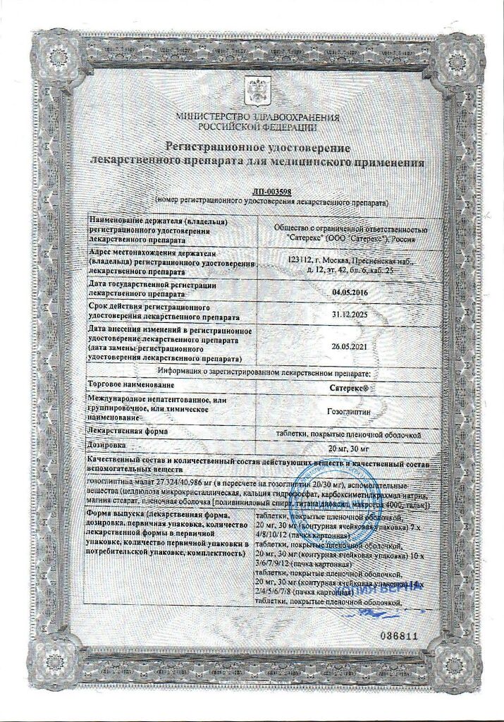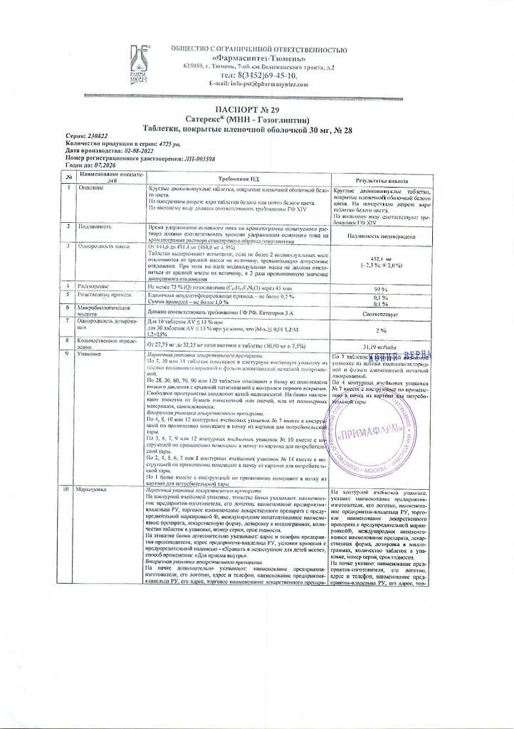 Документы Сатерекс таблетки покрыт.плен.об. 30 мг 28 шт