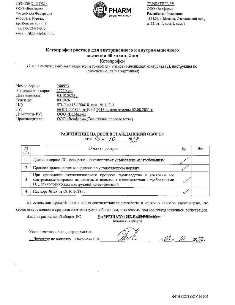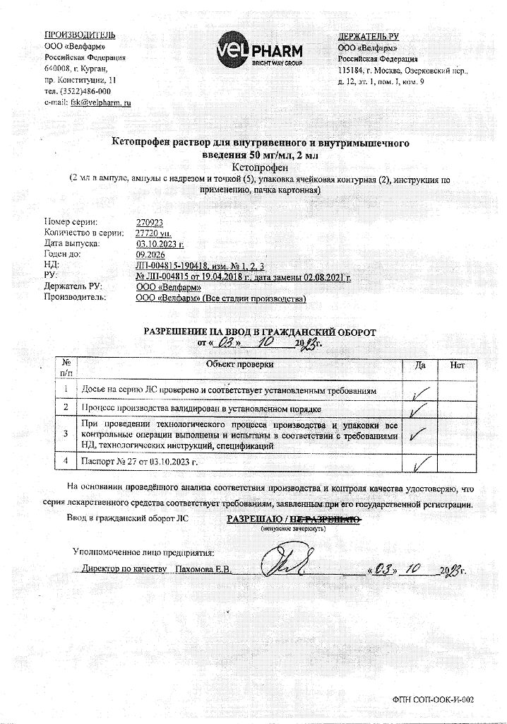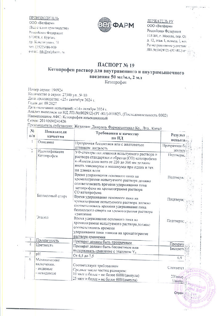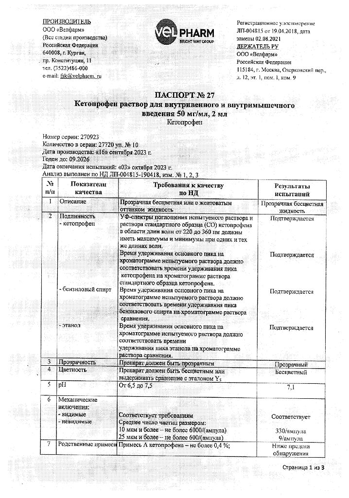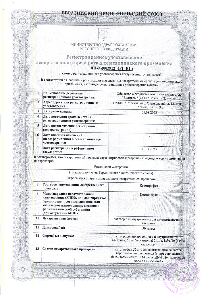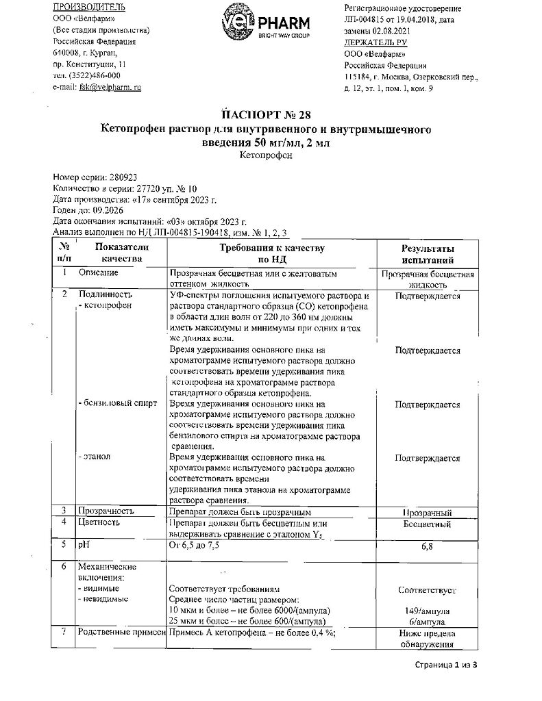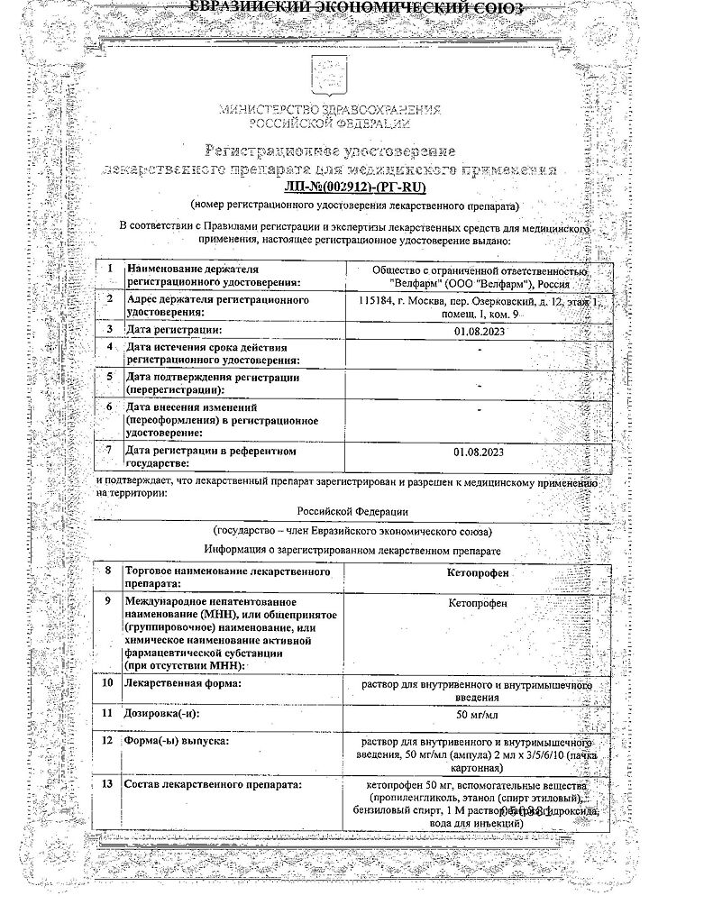 Документы Кетопрофен раствор для в/в и в/м введ. 50 мг/мл 2 мл 10 шт