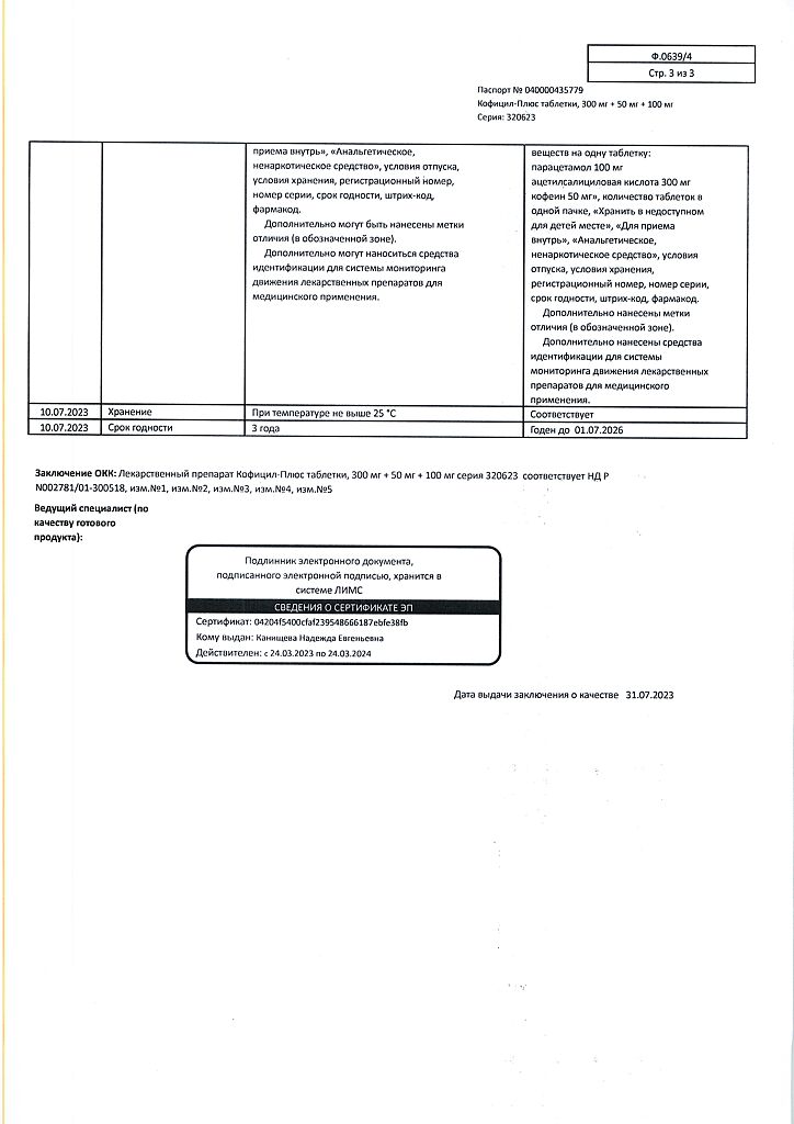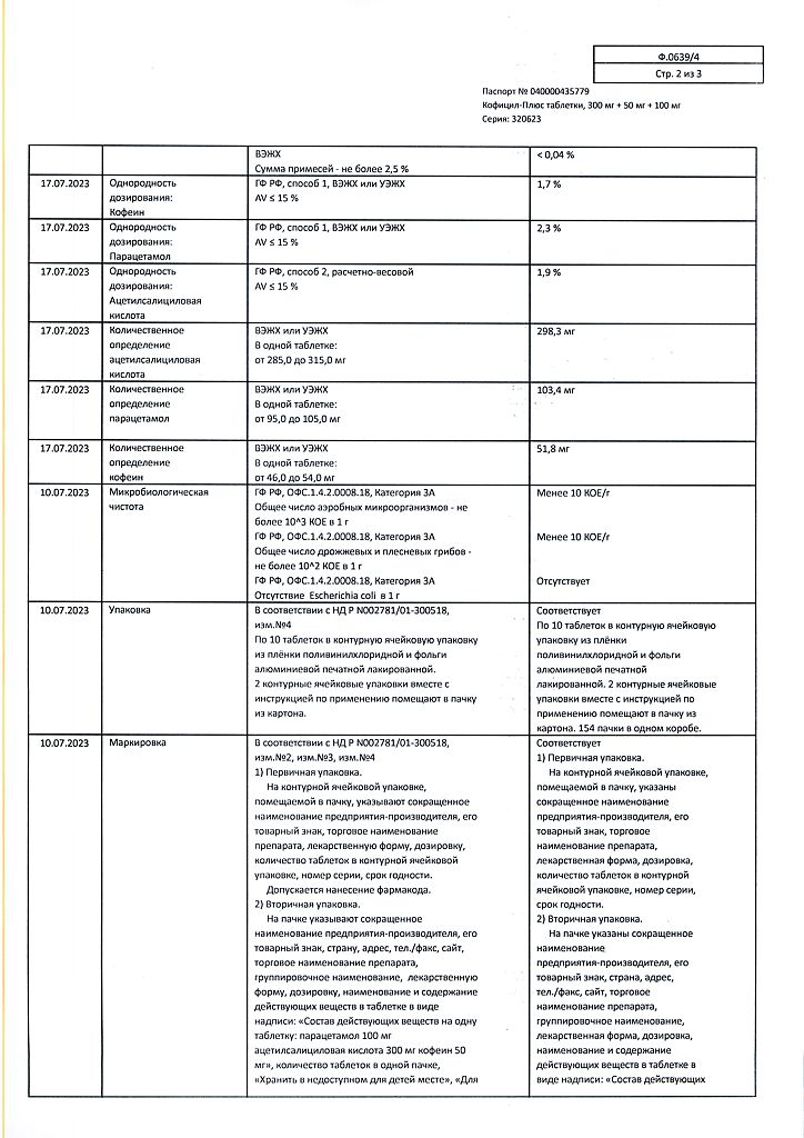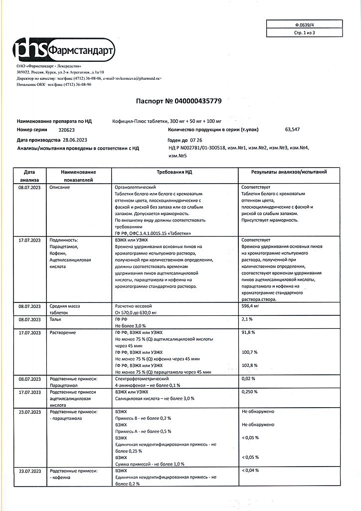Действующее вещество: Ацетилсалициловая кислота, Кофеин, Парацетамол