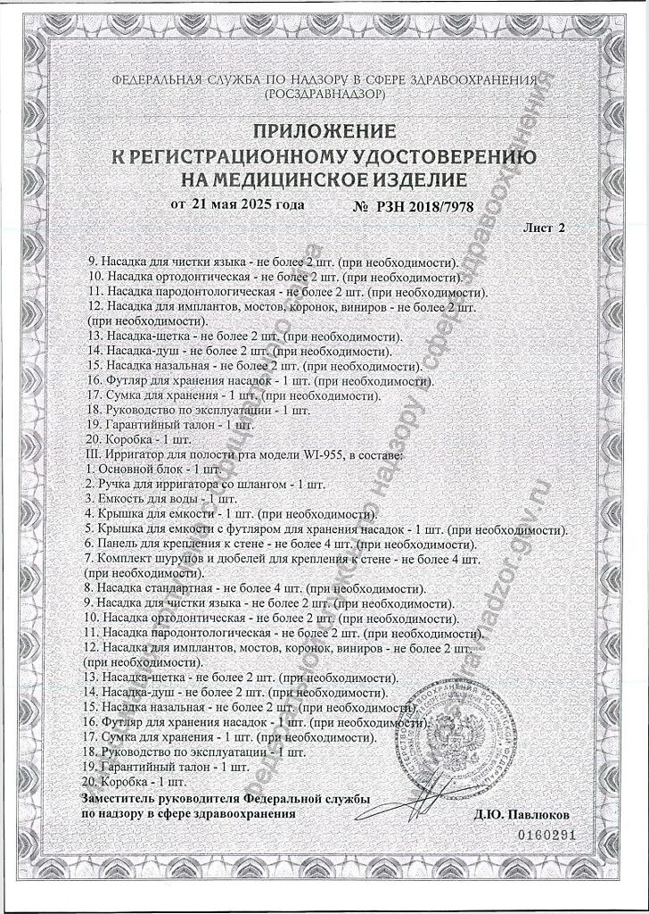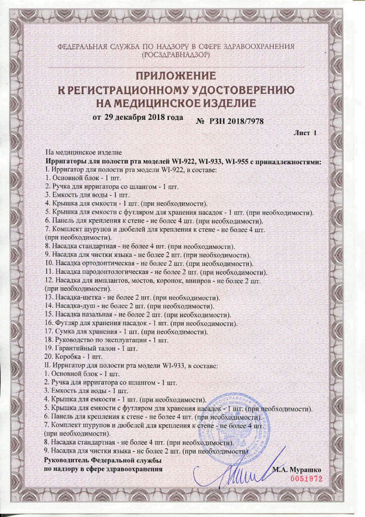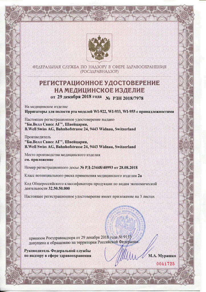 Документы Ирригатор для полости рта B.Well WI-933 стационарный семейный емкость 800 мл 1 шт