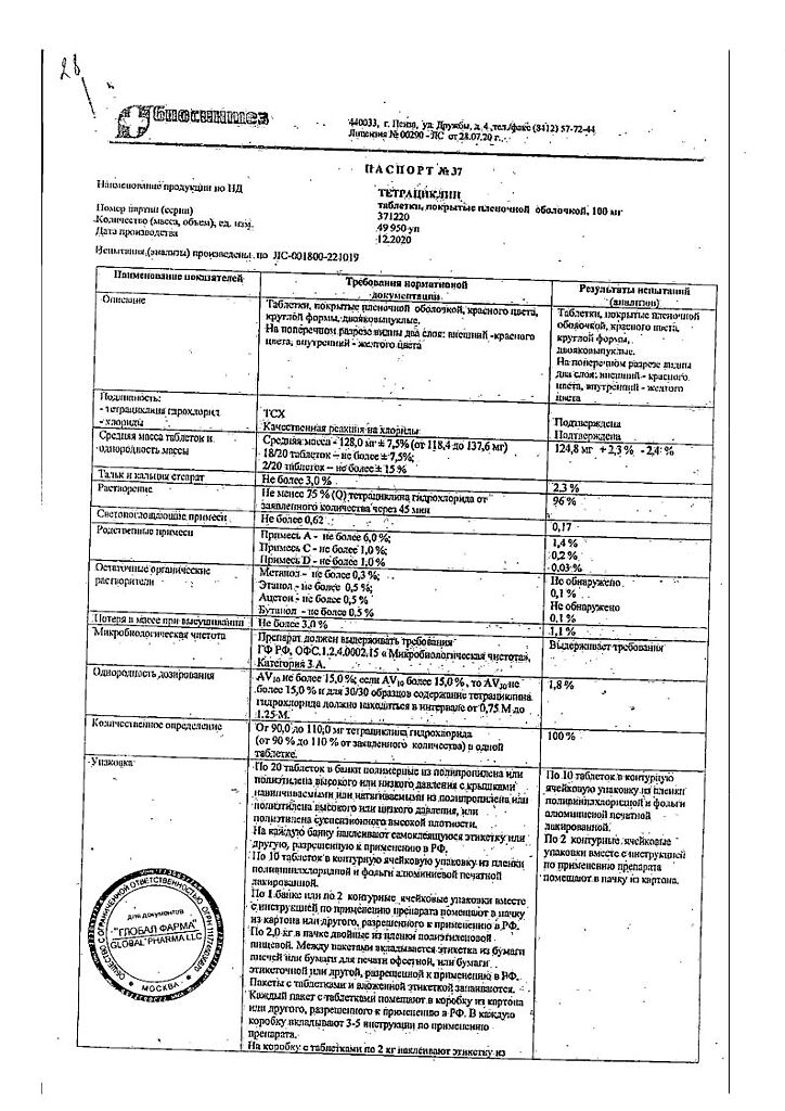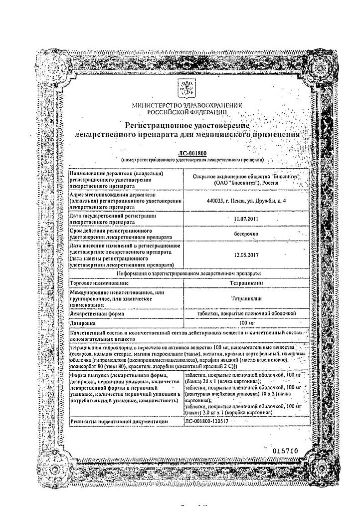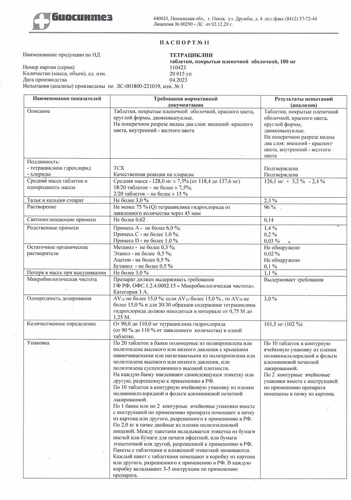 Тетрациклина гидрохлорид (в пересчете на действующее вещество) — 100,00 мг.