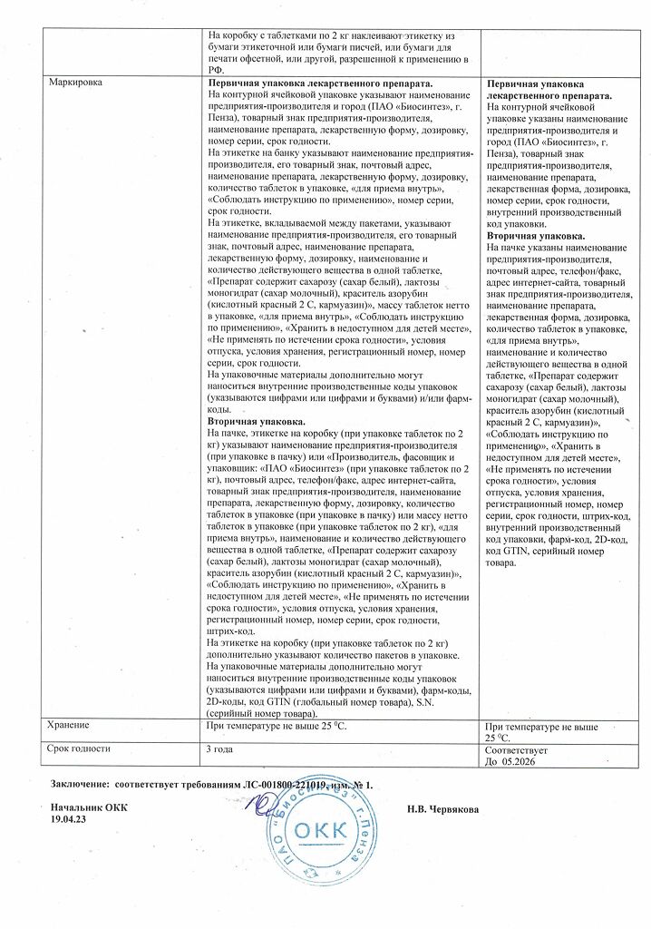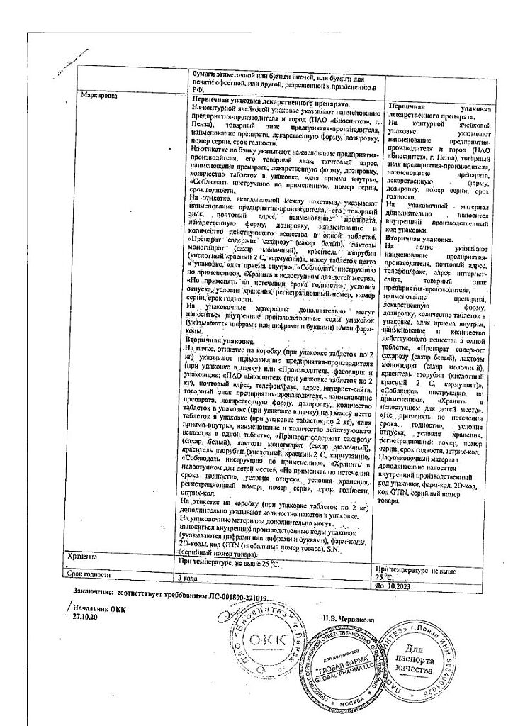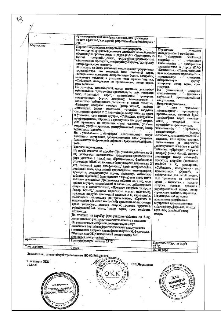 Гипромеллоза (оксипропилметилцеллюлоза), лактозы моногидрат (сахар молочный), полисорбат 80 (твин-80), краситель азорубин (кислотный красный 2C, кармуазин).