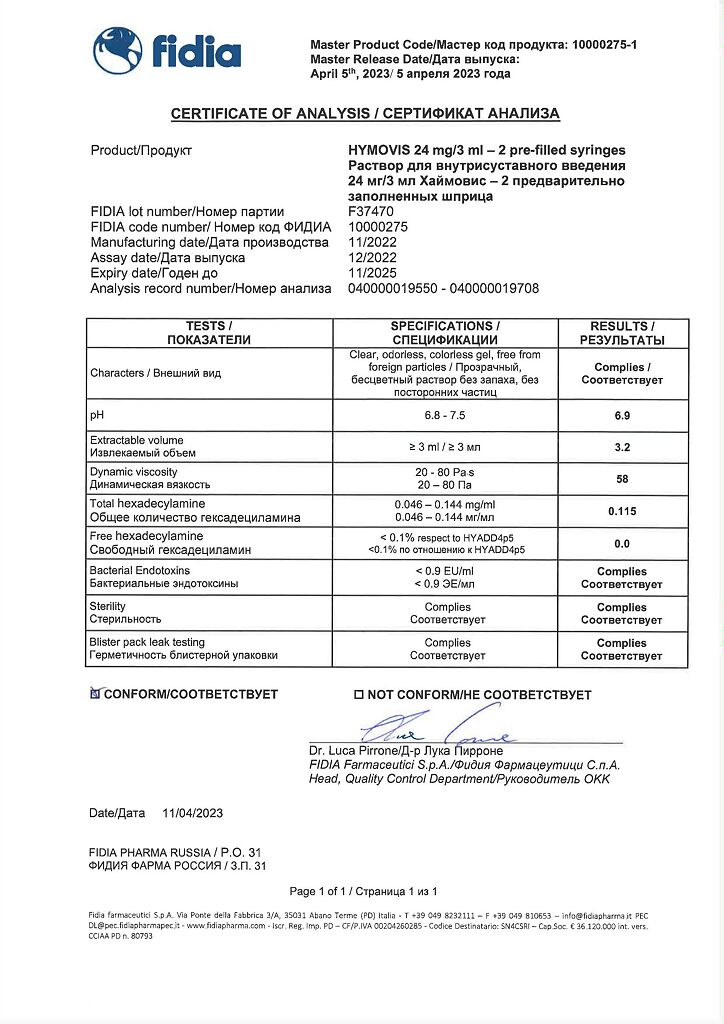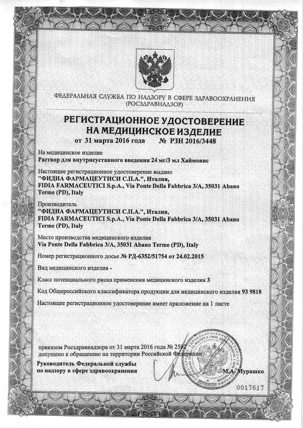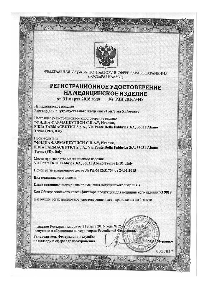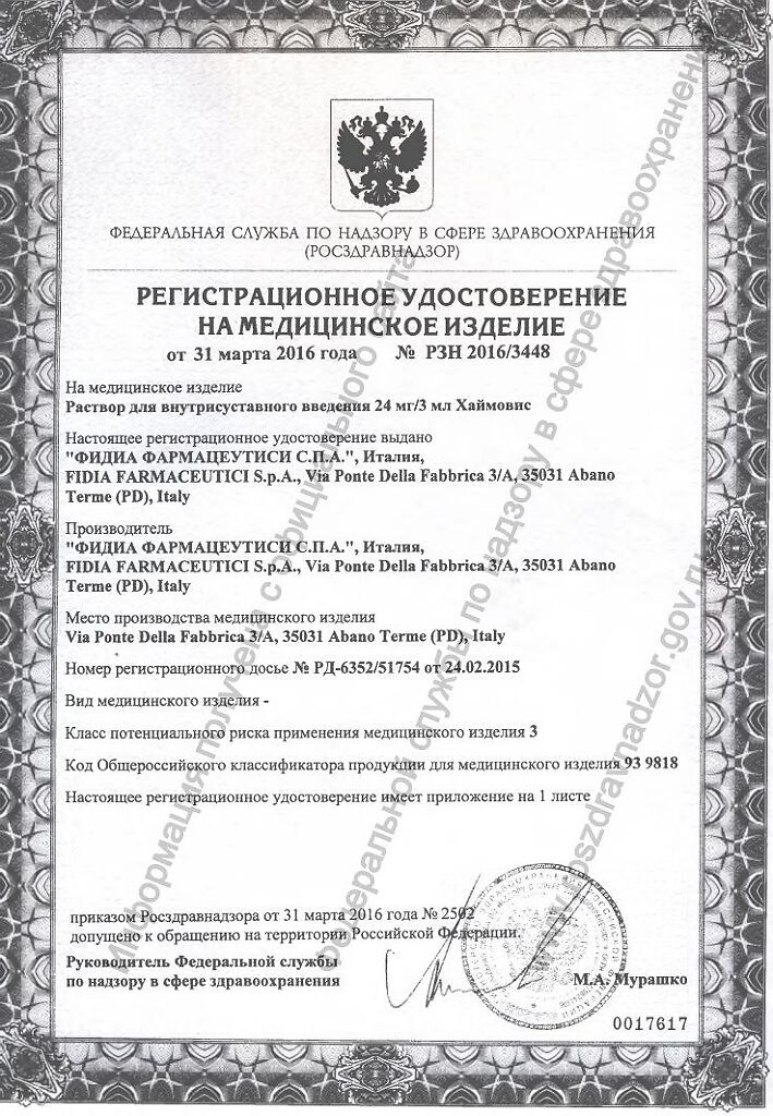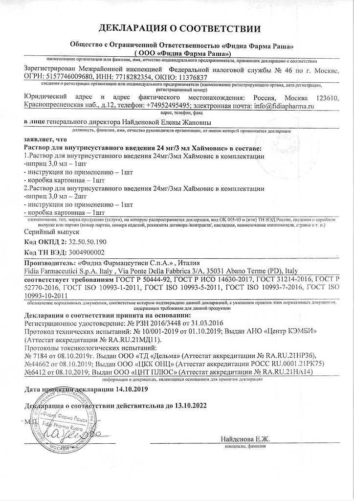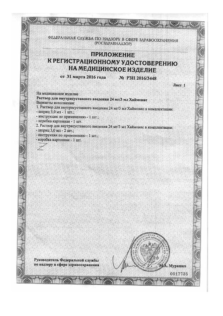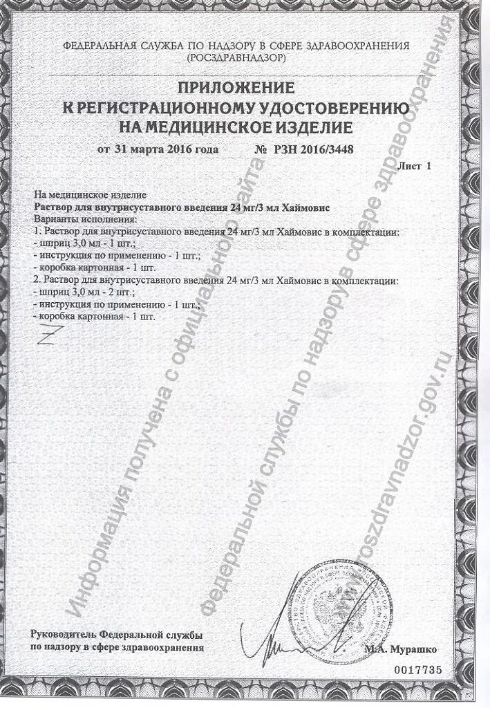 Документы Хаймовис раствор для внутрисуставного введения 24мг/3мл шприц 1 шт