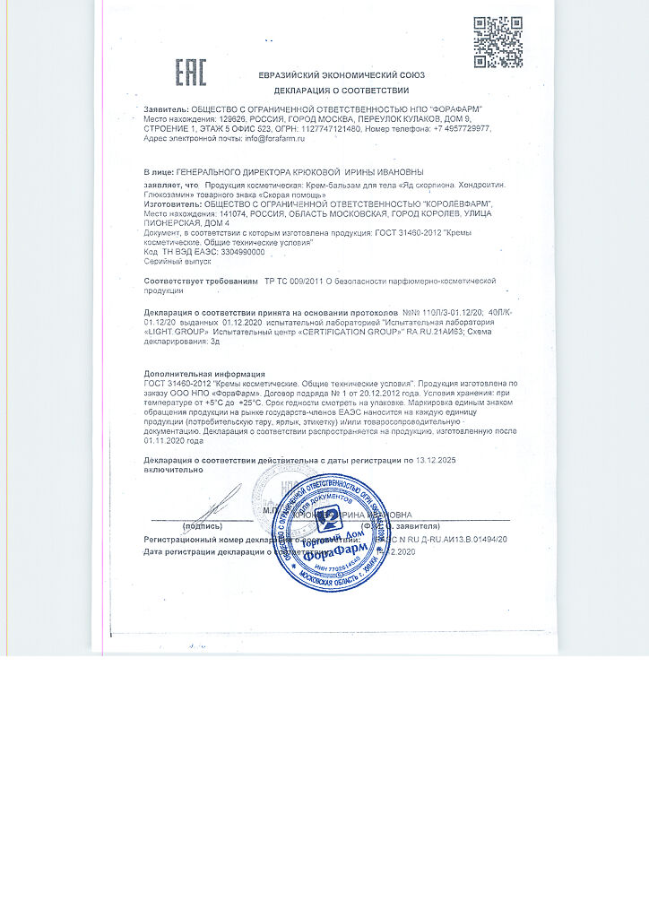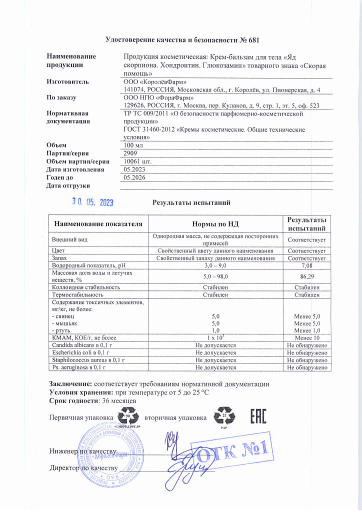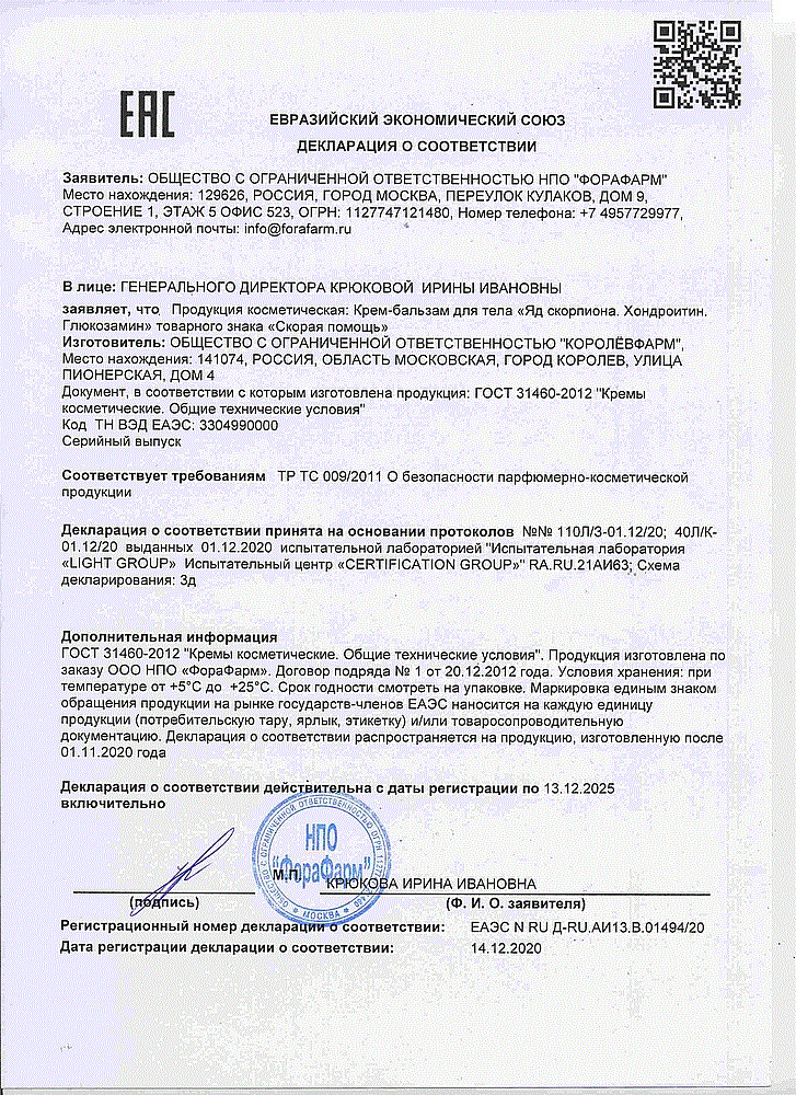 Документы Скорая Помощь Колени и суставы крем-бальзам для тела яд скорпионахондроитинглюкозамин 100 мл 1 шт