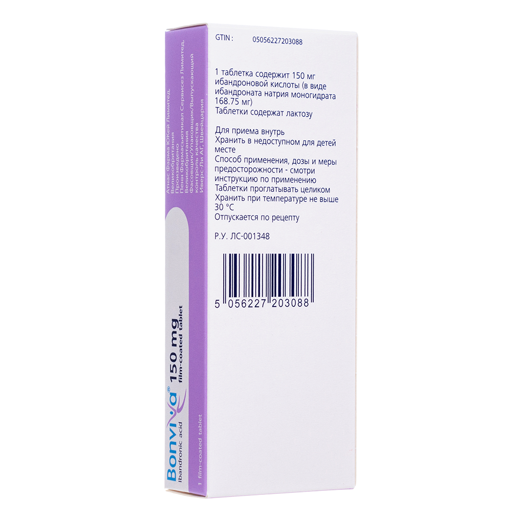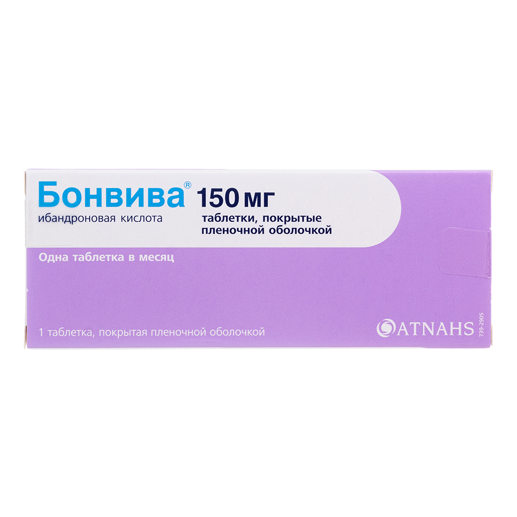 Таблетки, покрытые оболочкой, по 150 мг и раствор для внутривенного введения. Снижение сывороточной концентрации CТX на 28% отмечено уже через 24 часа после первого приема 150 мг Бонвивы, максимальное снижение составляло 68% через 6 дней. После третьего и четвертого приема препарата Бонвива 150 мг максимальное снижение сывороточного СТХ на 74% отмечено через 6 суток. Через 28 дней после приема четвертой дозы отмечено снижение супрессии биохимических маркеров костной резорбции до 56%.