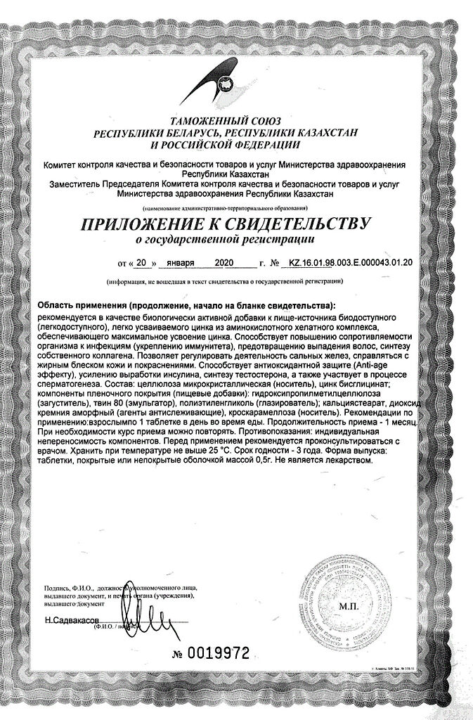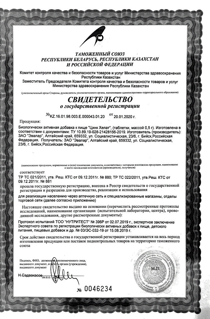 Документы Цинк хелат Эвалар Anti-Age таблетки массой 0,5 г 200 шт