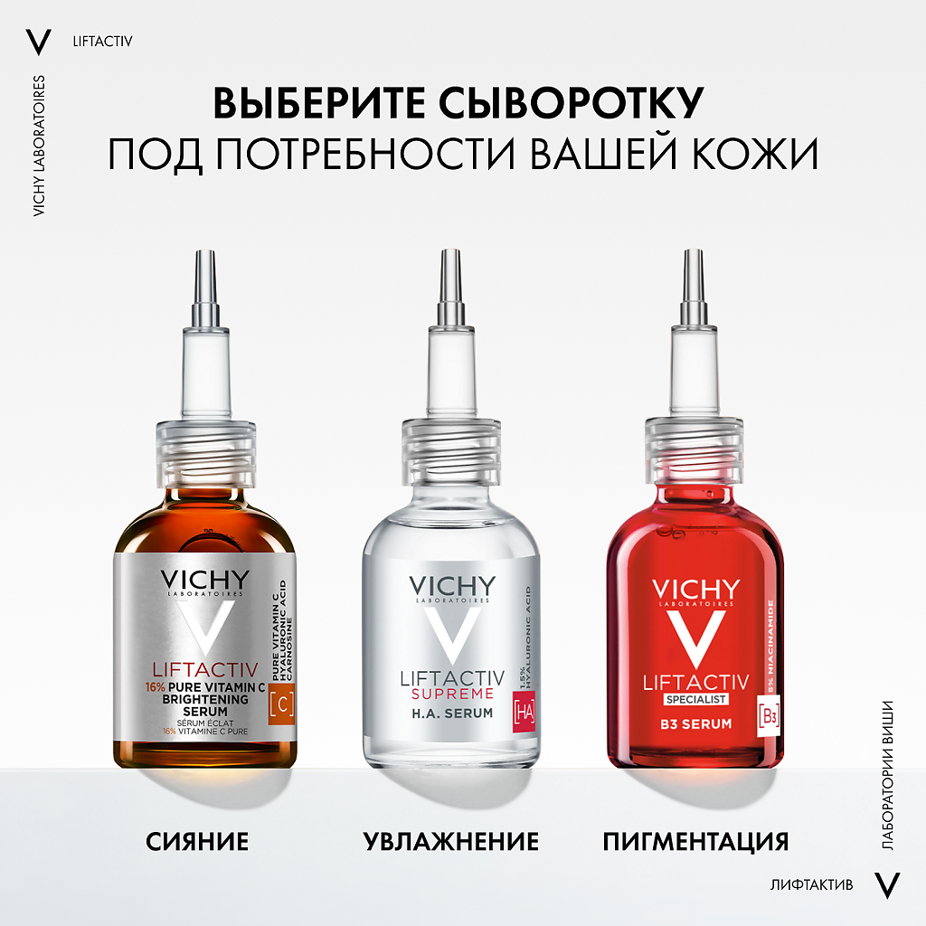 Возраст и агрессивное воздействие внешних факторов окружающей среды таких как загрязнение и УФ излучение, приводят к образованию морщин и тусклому цвету кожи. Для борьбы с этими проблемами была создана реновация сыворотка Vichy: Liftactiv Supreme сыворотка для сияния кожи с витамином C. Гипоаллергенная формула обогащена вулканической водой Vichy и эффективными антиоксидантами: чистый витамин С в концентрации 15%, пикногенол и Витамин Е.
