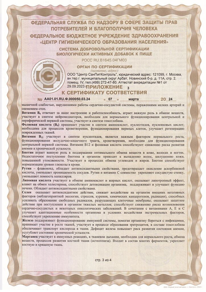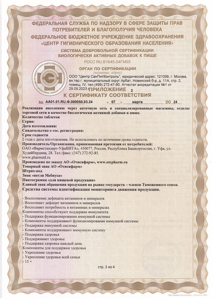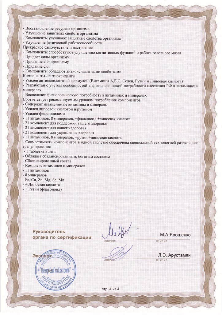 Носитель целлюлоза микрокристаллическая (Е460i), кальция гидрофосфата дигидрат, магния оксид, носитель  пищевая добавка [сополимер винилпирролидона и винилацетата], аскорбиновая кислота, железа сульфата гептагидрат, рутин, цинка сульфата гептагидрат, стабилизатор поливинилпирролидон (Е1201), загуститель гидроксипропилцеллюлоза (Е463), носитель кроскармелоза натрия (Е468),  агент антислеживающий кальция стеарат (Е470), никотинамид, краситель титана диоксид (Е171), агент антислеживающий  тальк (Е553), марганца сульфата моногидрат, кальция пантотенат, тиоктовая (липоевая) кислота, ретинола ацетат, глазирователь полиэтиленгликоль (Е1521), α-токоферола ацетат, меди сульфат, пиридоксина гидрохлорид, агент антислеживающий кремния диоксид (Е551), рибофлавин, стабилизатор мальтодекстрин, стабилизатор модифицированный пищевой крахмал картофельный, тиамина гидрохлорид, эмульгатор полисорбат 80 (Твин 80) (Е433), наполнитель этилцеллюлоза (Е462), глазирователь воск карнаубский (Е903), селенит натрия, фолиевая кислота, биотин, цианокобаламин.