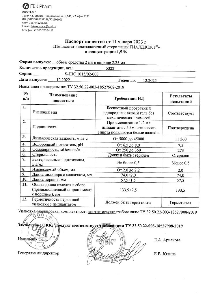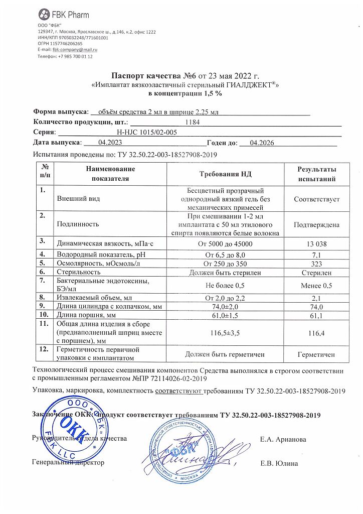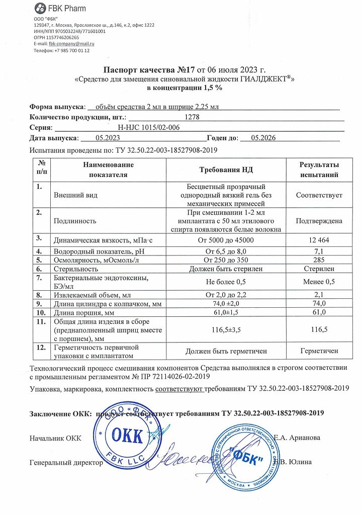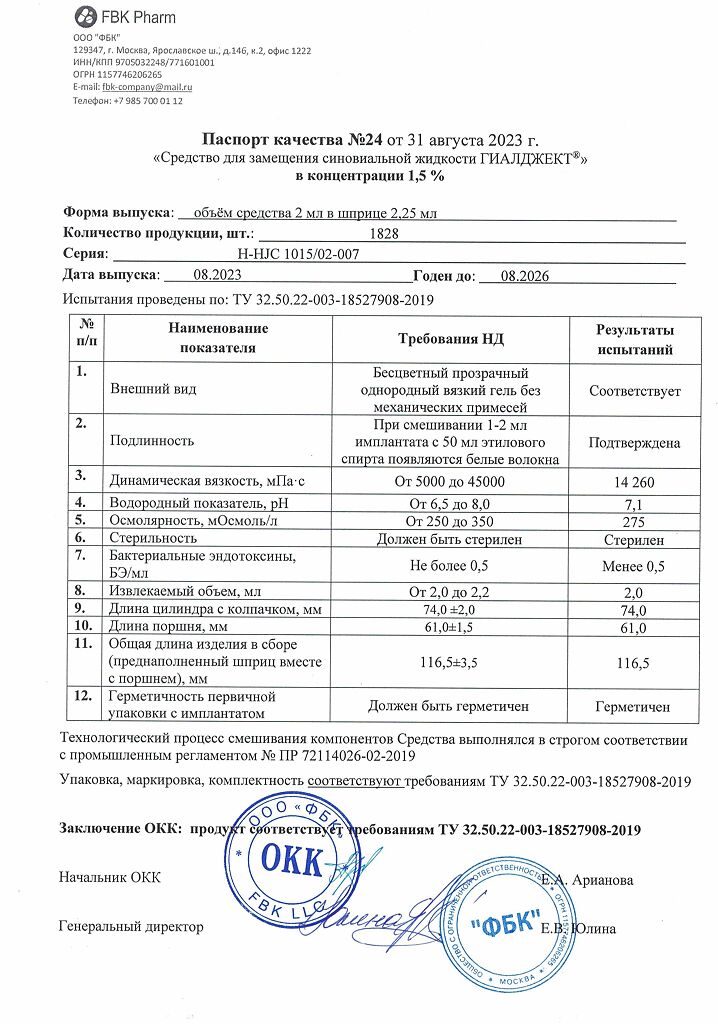 2. Имплантат вязкоэластичный стерильный ГИАЛДЖЕКТ® по ТУ 32.50.22-003-18527908-2019 в индивидуальной упаковке (преднаполненный шприц, упакованный в блистер, с иглой одноразовой (21G (0,8 мм × 50 мм)) одного из вариантов исполнения – 1 уп.