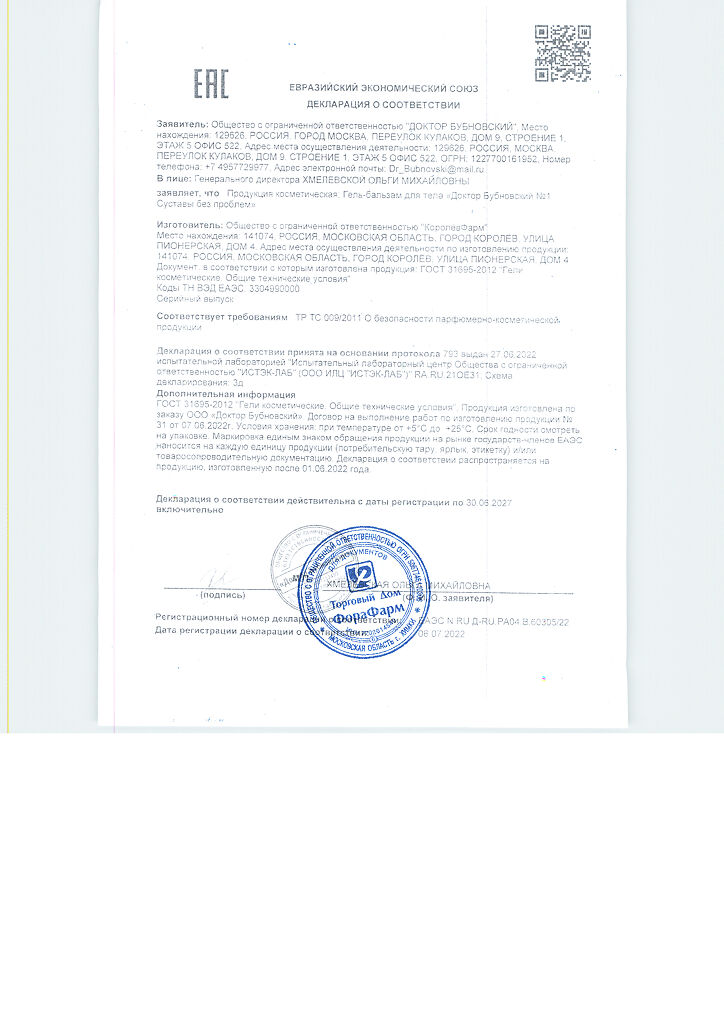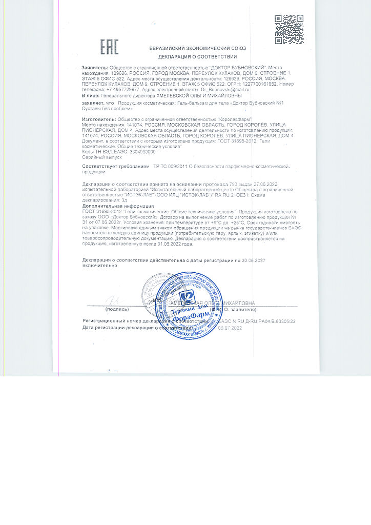 Документы Доктор Бубновский №1 Суставы без проблем гель-бальзам для суставов и мышц 125 мл 1 шт