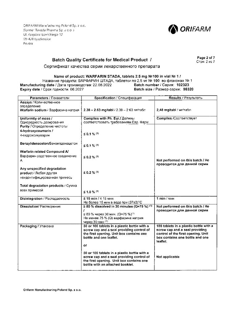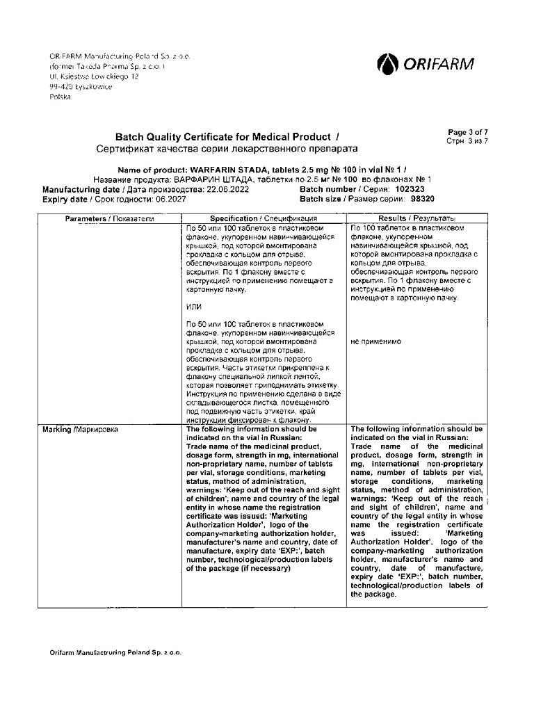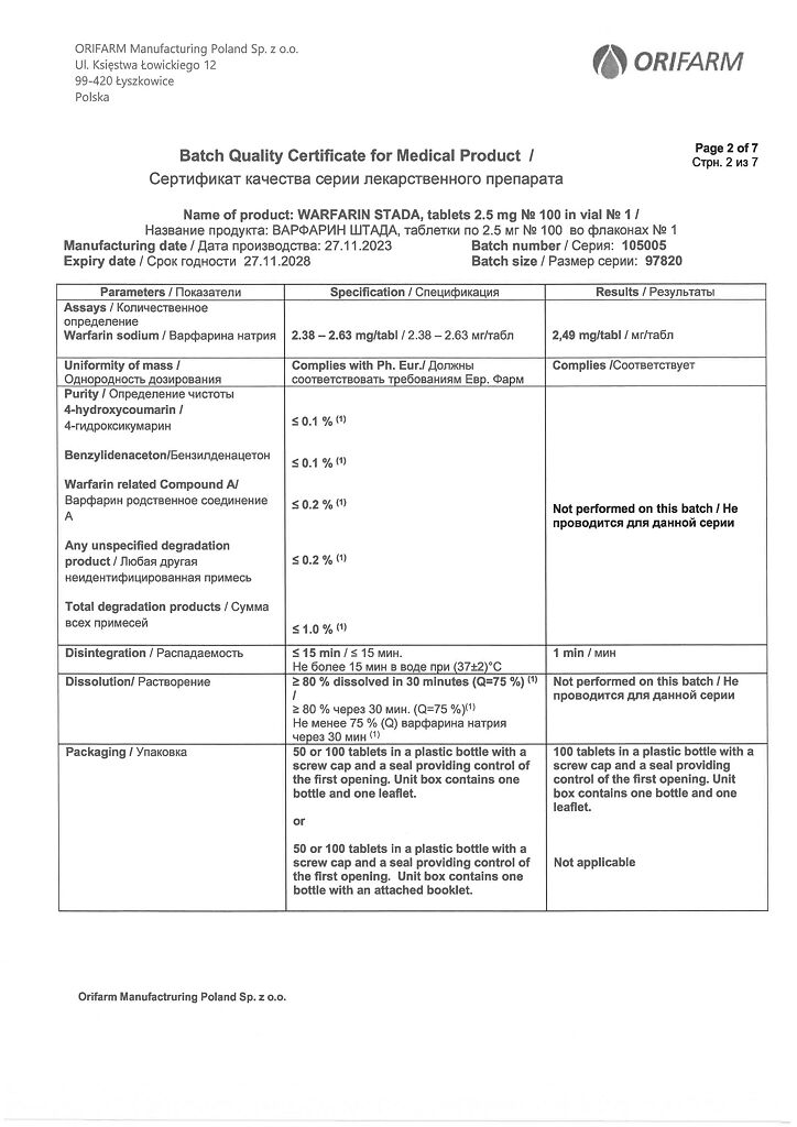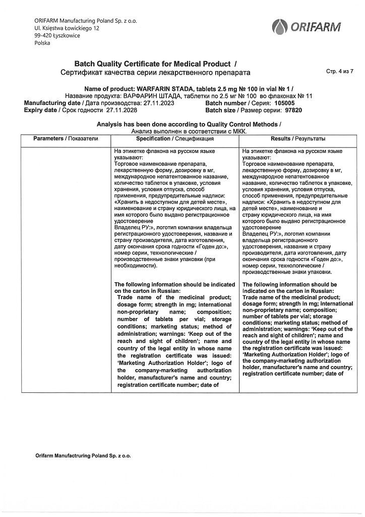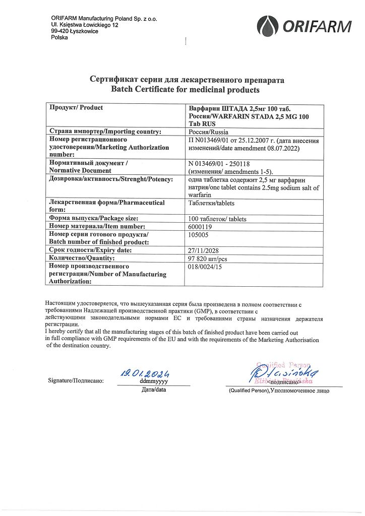 Действующее вещество: Варфарин