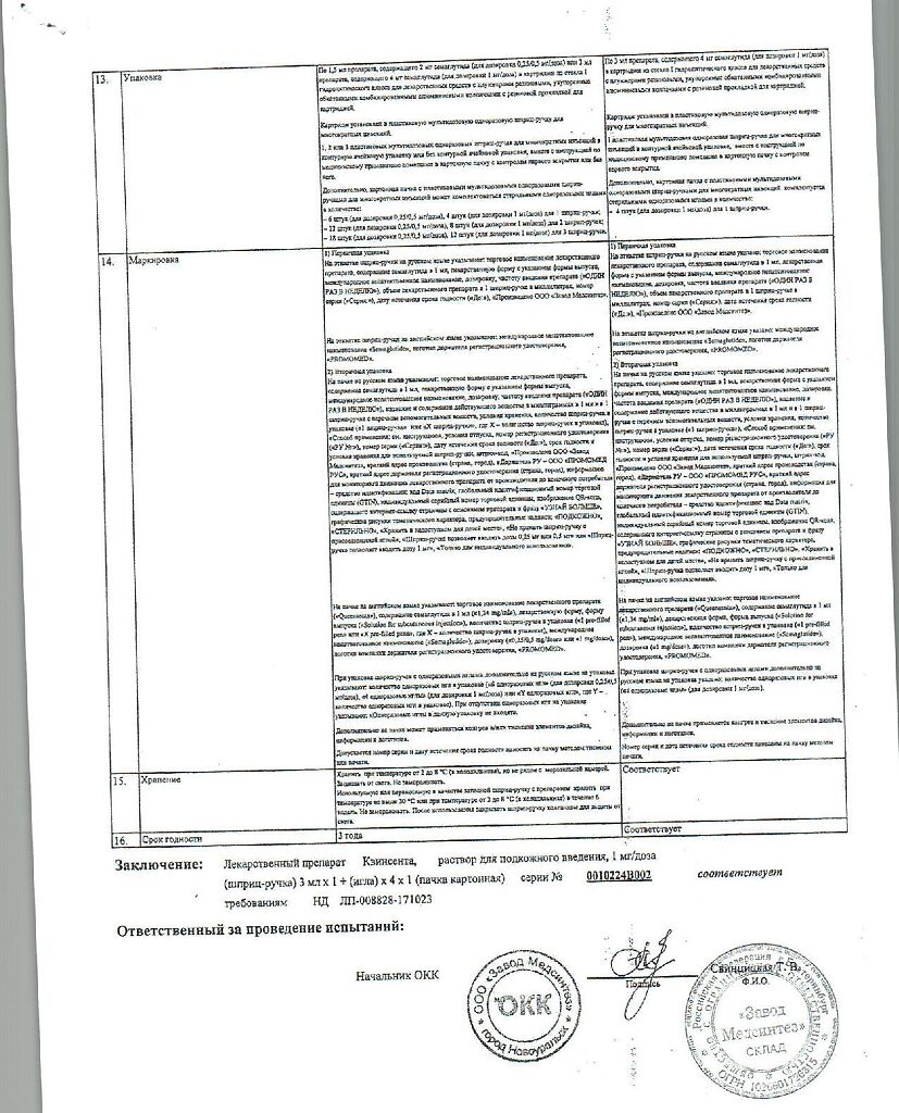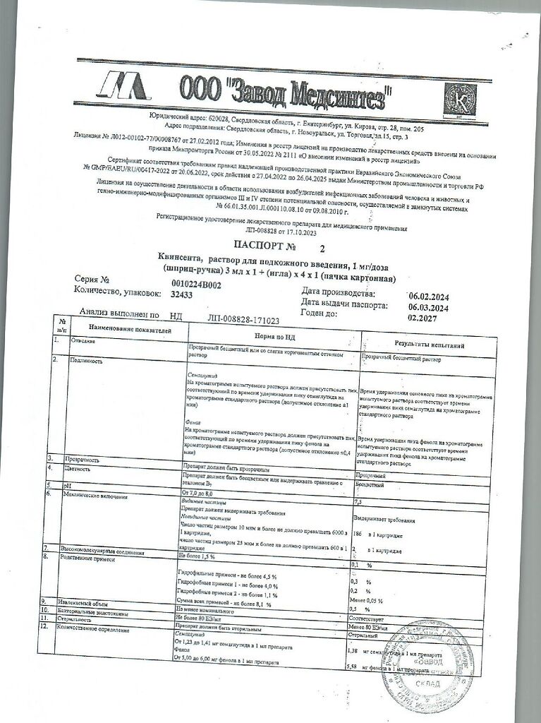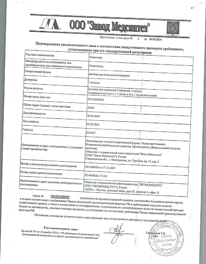 Документы Квинсента раствор для п/к введ 1 мг/доза 3 мл 1 уп