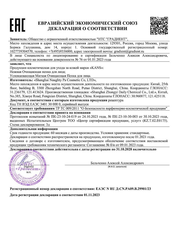 Документы KANS Пенка для лица нежная очищающая 200 мл 1 шт