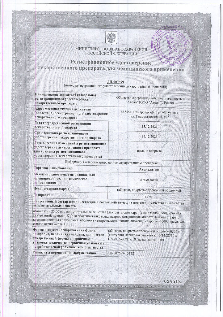 Документы Агомелатин таблетки покрыт.плен.об. 25 мг 28 шт