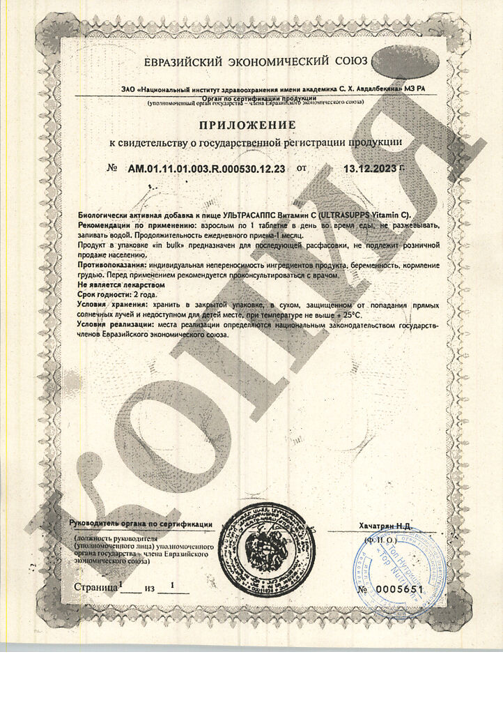 Документы Ультрасаппс Витамин С/ Ultrasupps Vitamin C таблетки массой 1260 мг 60 шт