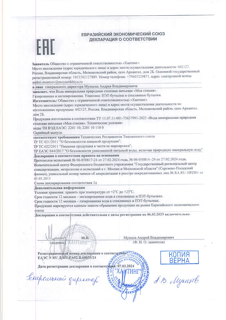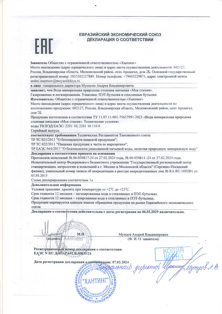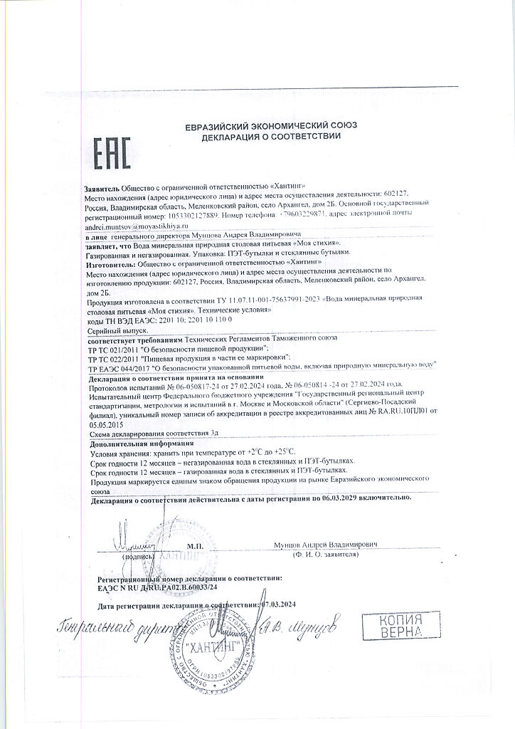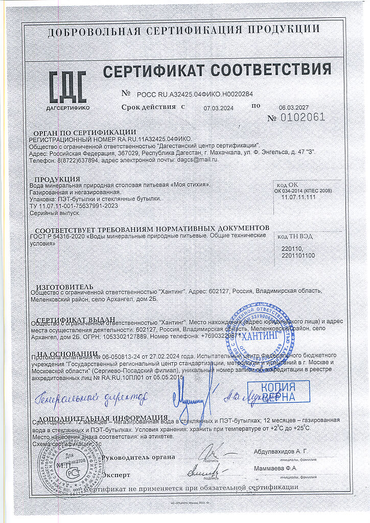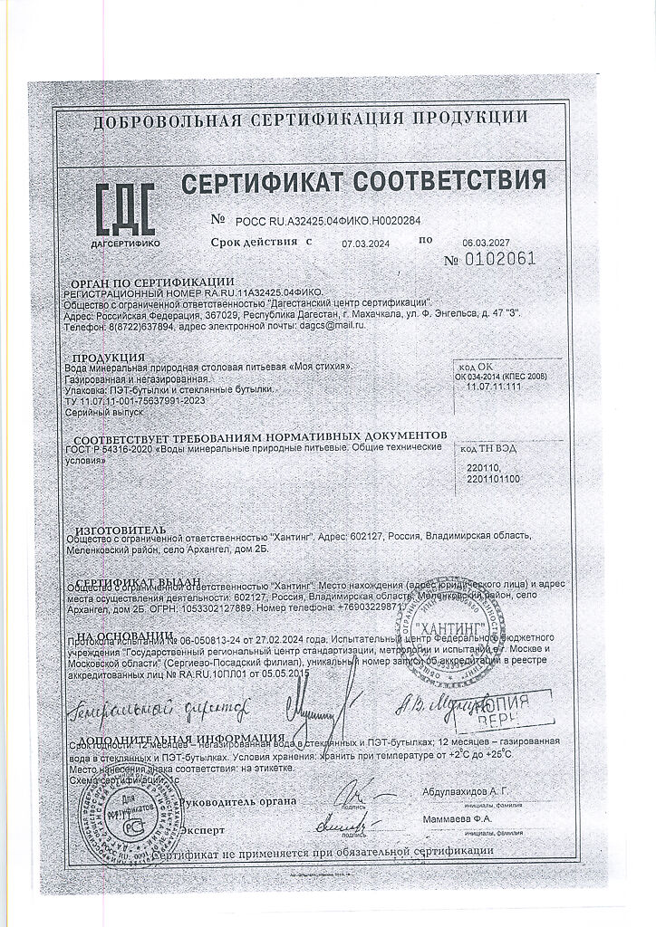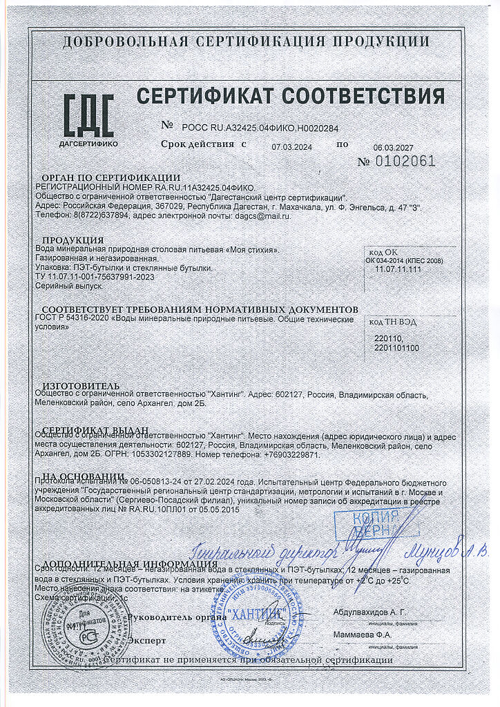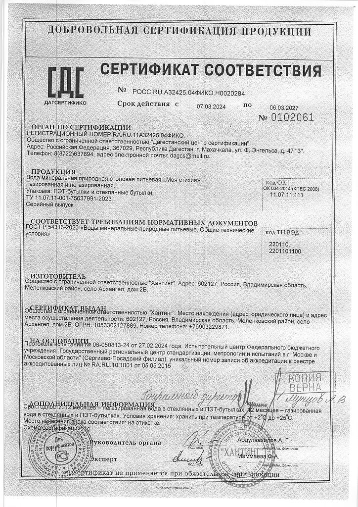 Сертификаты Вода Моя Стихия минеральная природная столовая питьевая негазированная ПЭТ 1 л 1 шт