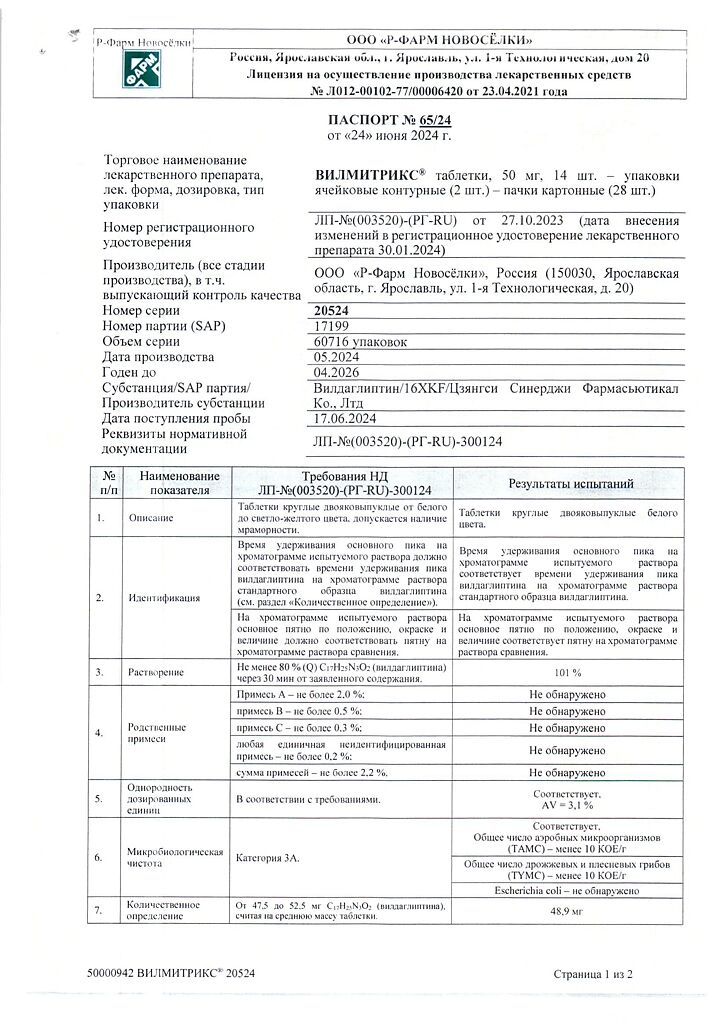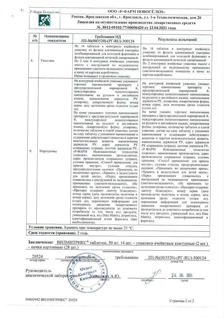 Документы Вилмитрикс таблетки 50 мг 28 шт
