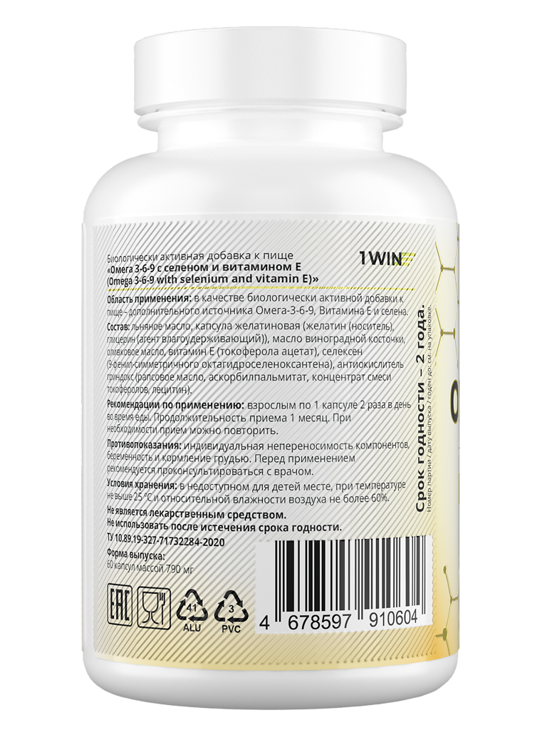 1WIN Oмега 3-6-9 + Селен и Витамин Е / Omega 3-6-9 + selenium and vitamin E капсулы массой 790 мг 60 шт