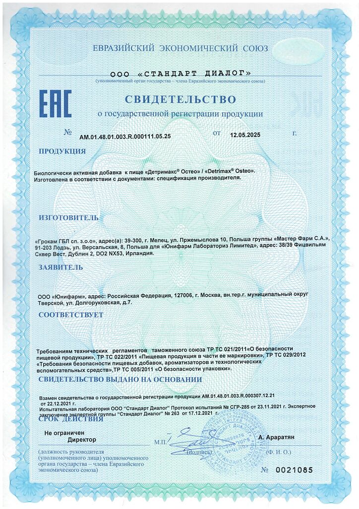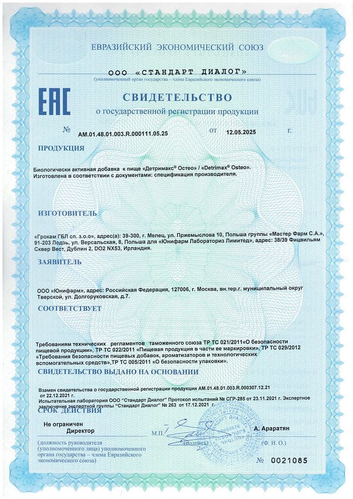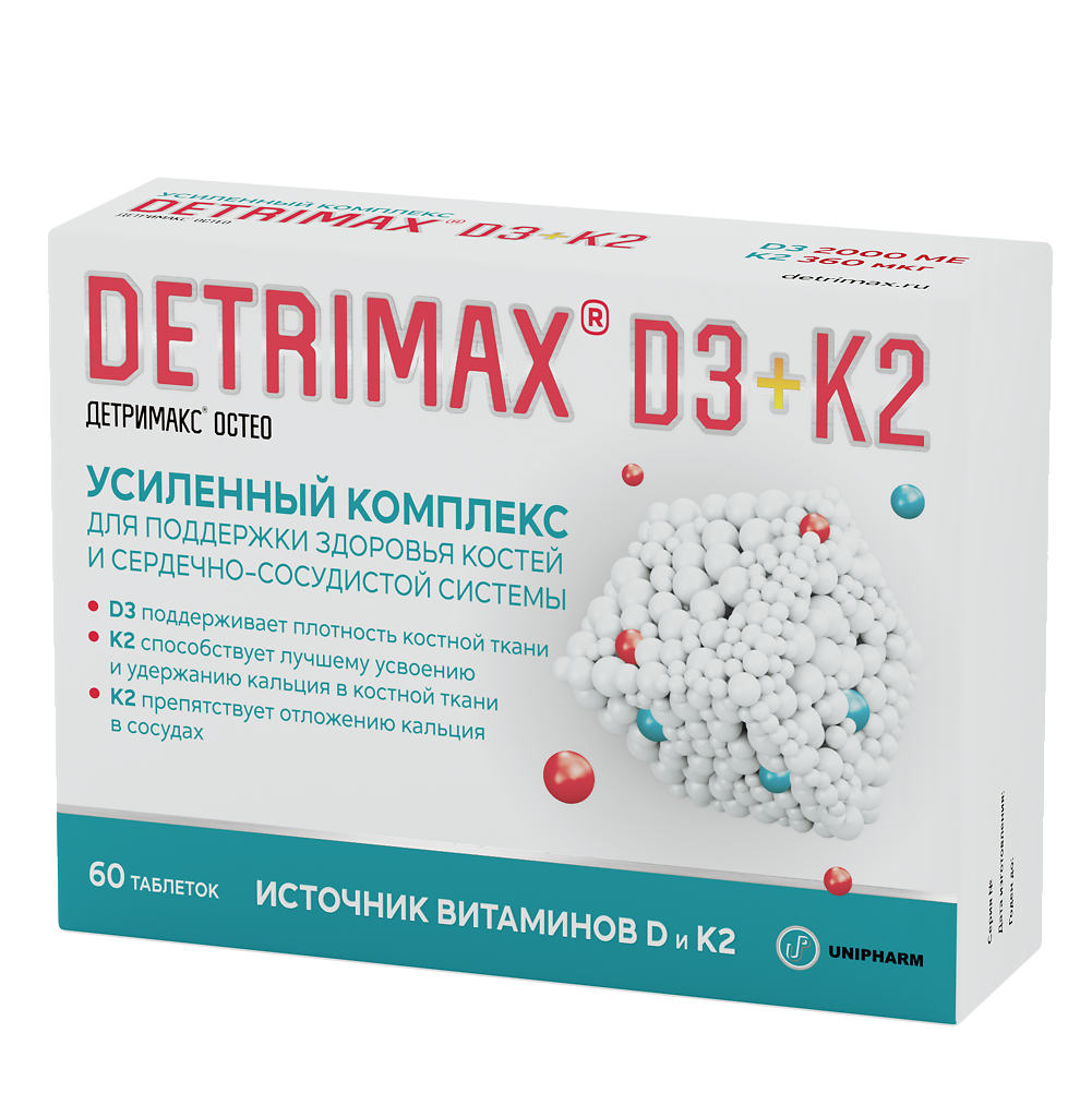 ДЕТРИМАКС® ОСТЕО рекомендуется в качестве биологически активной добавки к пище – дополнительного источника витамина D и витамина К2, способствует поддержанию плотности и нормальной структуры костной ткани, лучшему усвоению и удержанию кальция в костной ткани, препятствует отложению кальция в сосудах, что способствует поддержанию здоровья сердечно-сосудистой системы.